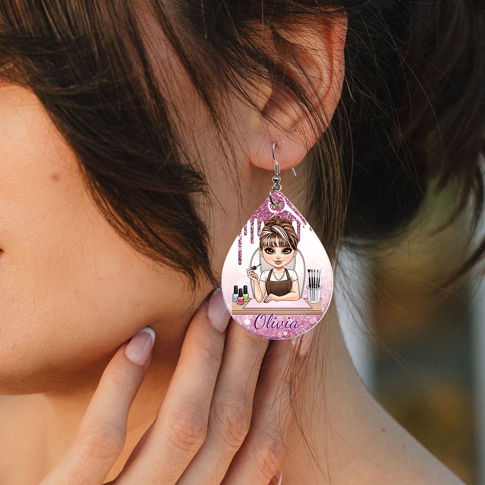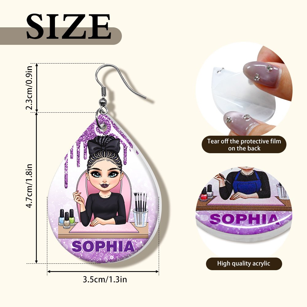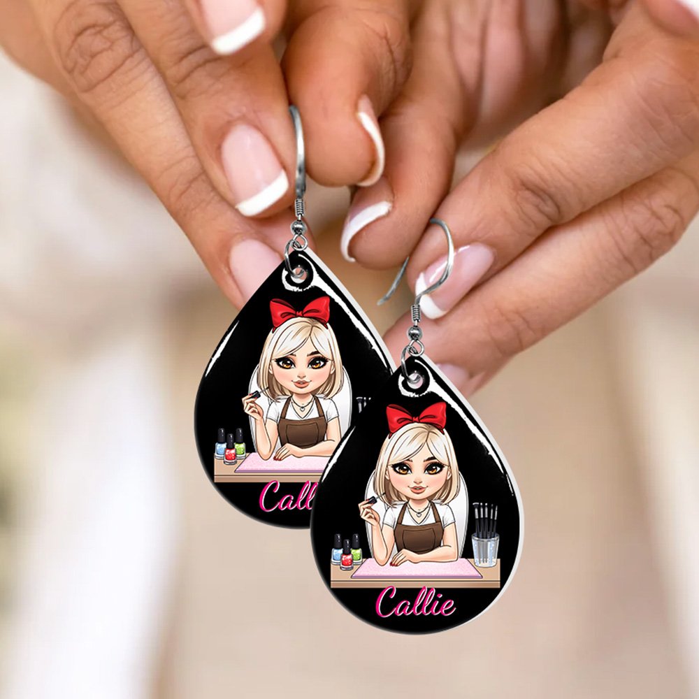 The earrings perfectly combine a cute cartoon girl based on your image with salon-themed elements such as nail polish bottles and brushes, creating a stylish and sophisticated atmosphere. We provide 10 font colors for you to choose according to your preferences. You can also customize your name to show your unique personality.