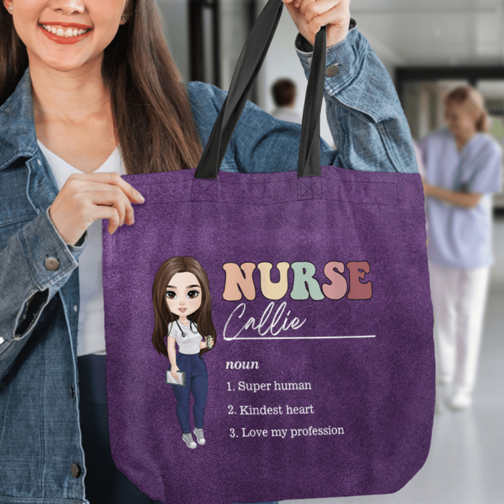Personalize your bag with a charming cartoon medical character, name, and unique phrases reflecting your profession. This playful and practical design makes it a memorable gift or a delightful treat for yourself.