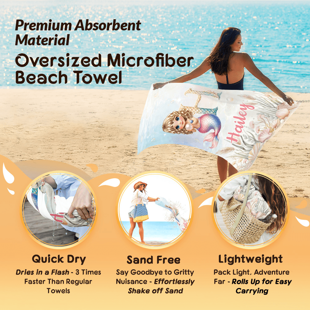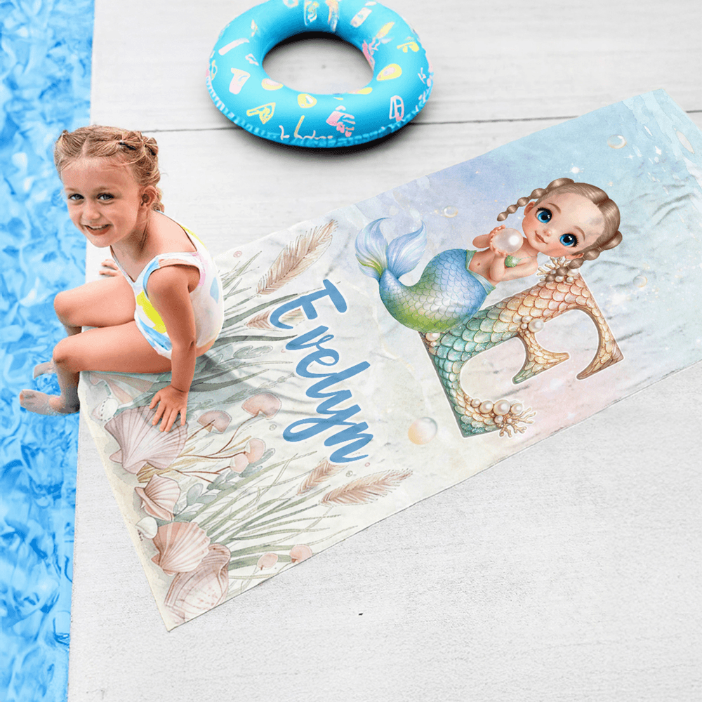 Personalized Cartoon Mermaid Character Initial Quick Dry Beach Towel with Name Outdoor Activities Beach Party Birthday Gift for Girls Besties Family