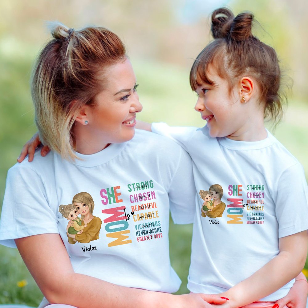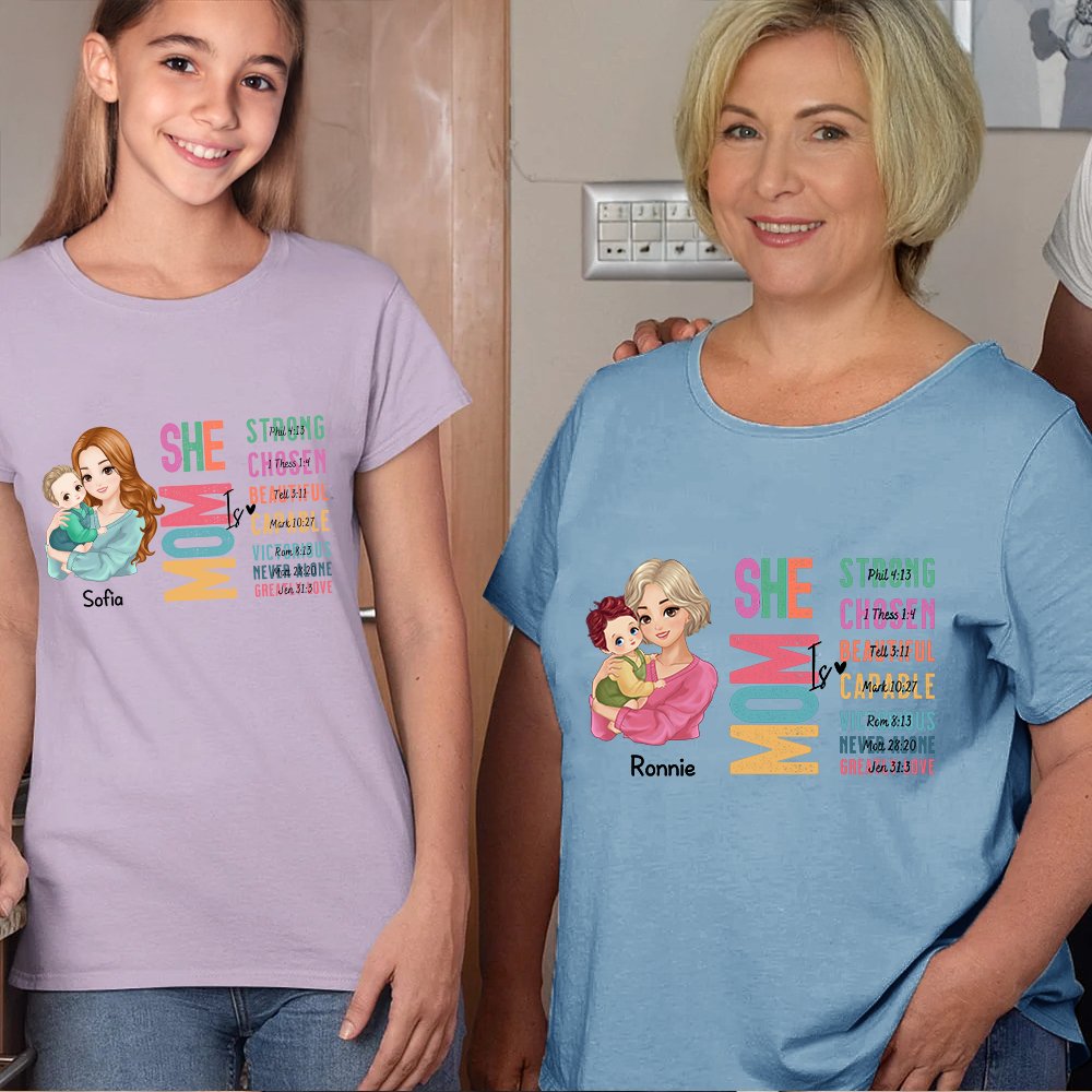 The front of the T-shirt depicts the mother-child relationship in a soft cartoon style, which is warm and makes people feel the warmth of home at a glance. With powerful Bible verses, she is a mother and strong, beautiful, capable, etc., conveying the faith and power contained in maternal love. In addition, the mother's name can be customized to make each T-shirt unique and full of personal meaning.