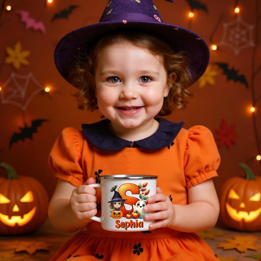 The enamel mug features classic Halloween elements such as pumpkins, ghosts, and bats, along with fun cartoon characters and vibrant orange initials. The design cleverly incorporates the child's name, creating a whimsical touch that radiates holiday cheer. Every detail captures the essence of Halloween, allowing children to enjoy festive joy and artistic flair as they raise their mugs.