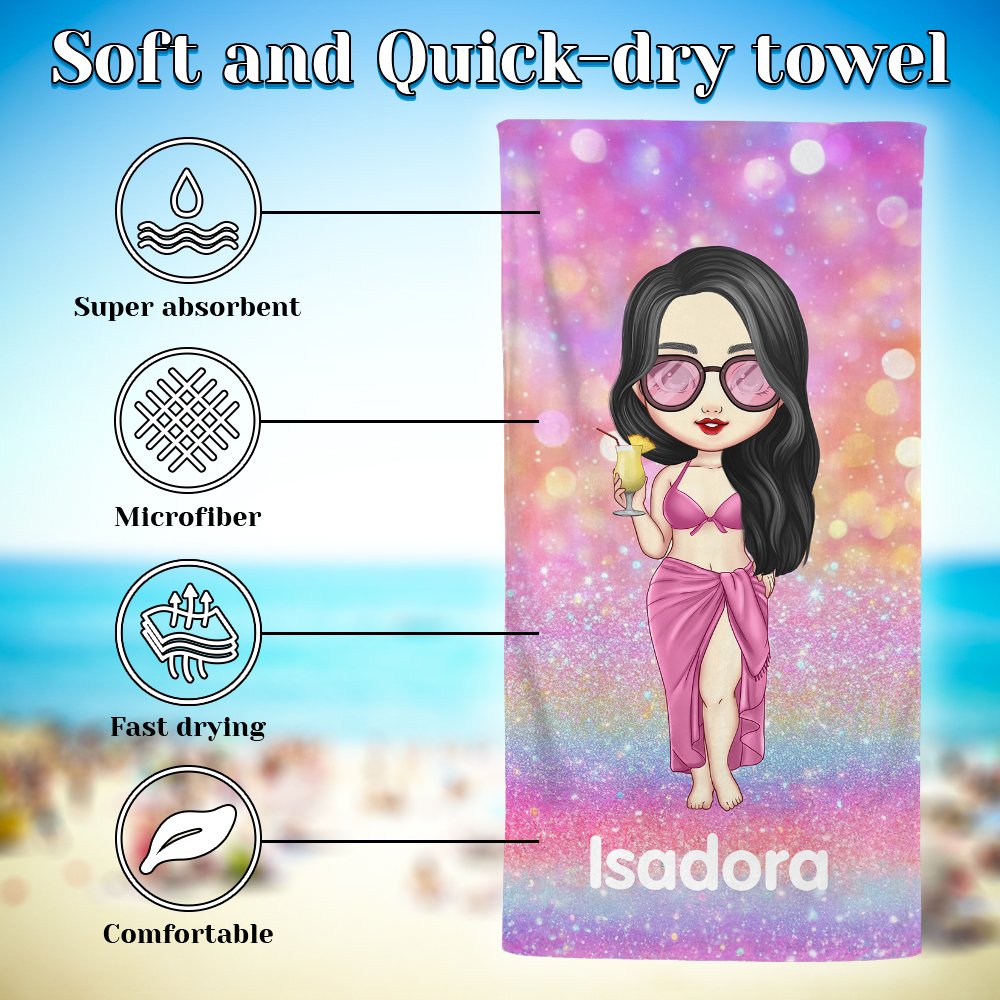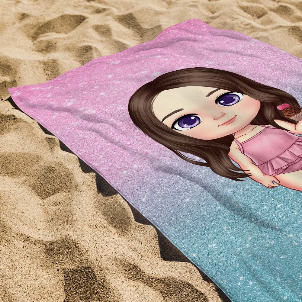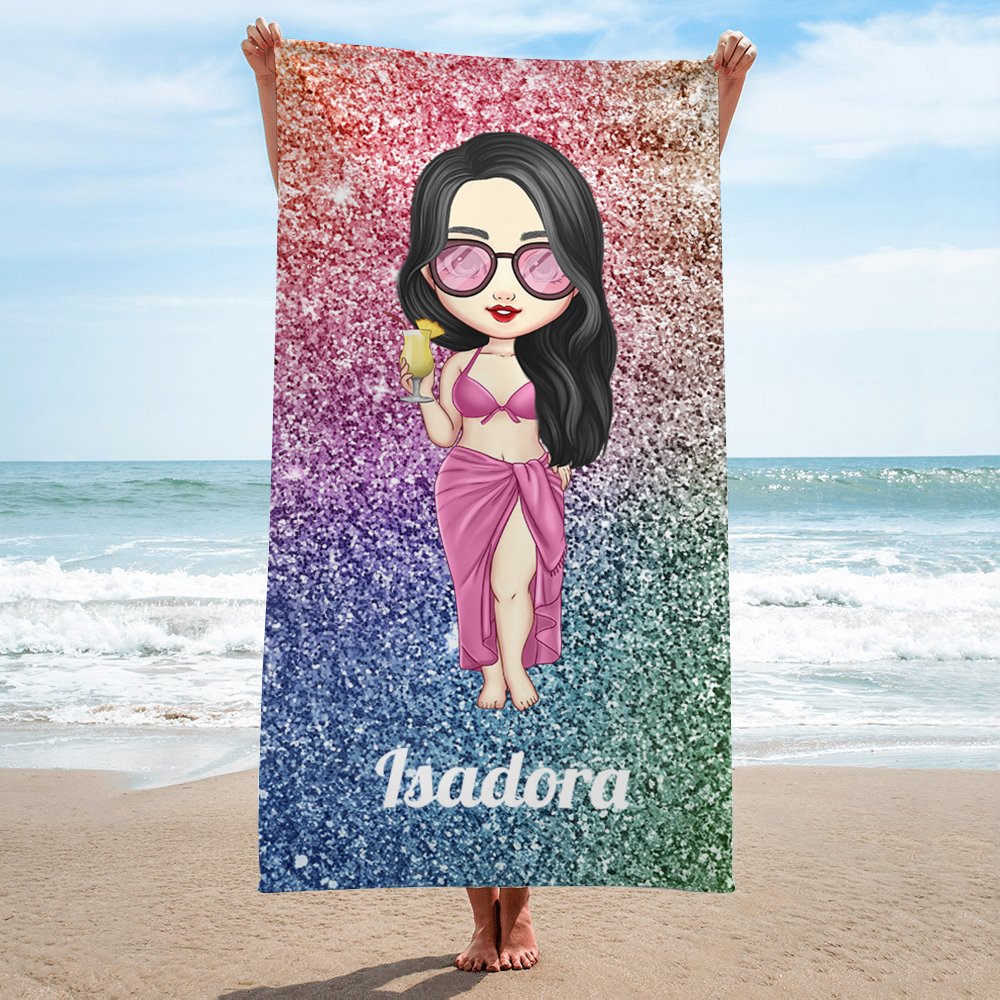 This beach towel features a delightful cartoon woman and girl character, which can be customized with the recipient's name, adding a unique and personal touch to their beach activities. Enhanced with 25 style shimmering sequins as a backdrop, it's a loving and fun surprise for kids or a cozy gift for adults.