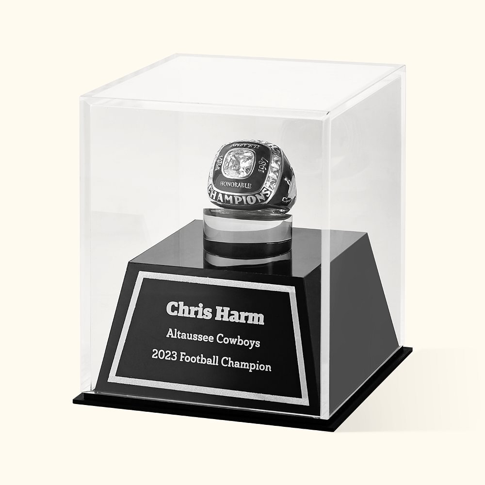 The championship ring display case is the perfect way to showcase your hard-earned sports championship rings. The black base adds a touch of elegance to the presentation, and the clear acrylic cover allows for easy viewing while protecting your rings from dust and fading.