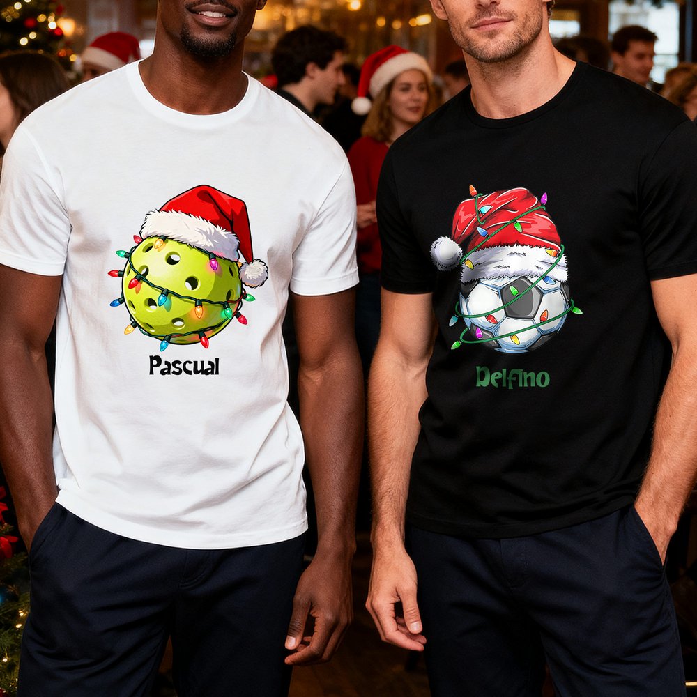 You can pick from 12 sports ball designs (like golf, tennis, baseball, basketball), each featuring a Santa hat and festive string lights. Add your name to make it unique. Plus, choose from styles like crewneck sweatshirt, hoodie, or T-shirt, and a wide array of colors (such as white, black, red, purple) to suit your style. This level of customization turns the clothing into a personalized symbol of your sports love and holiday spirit.