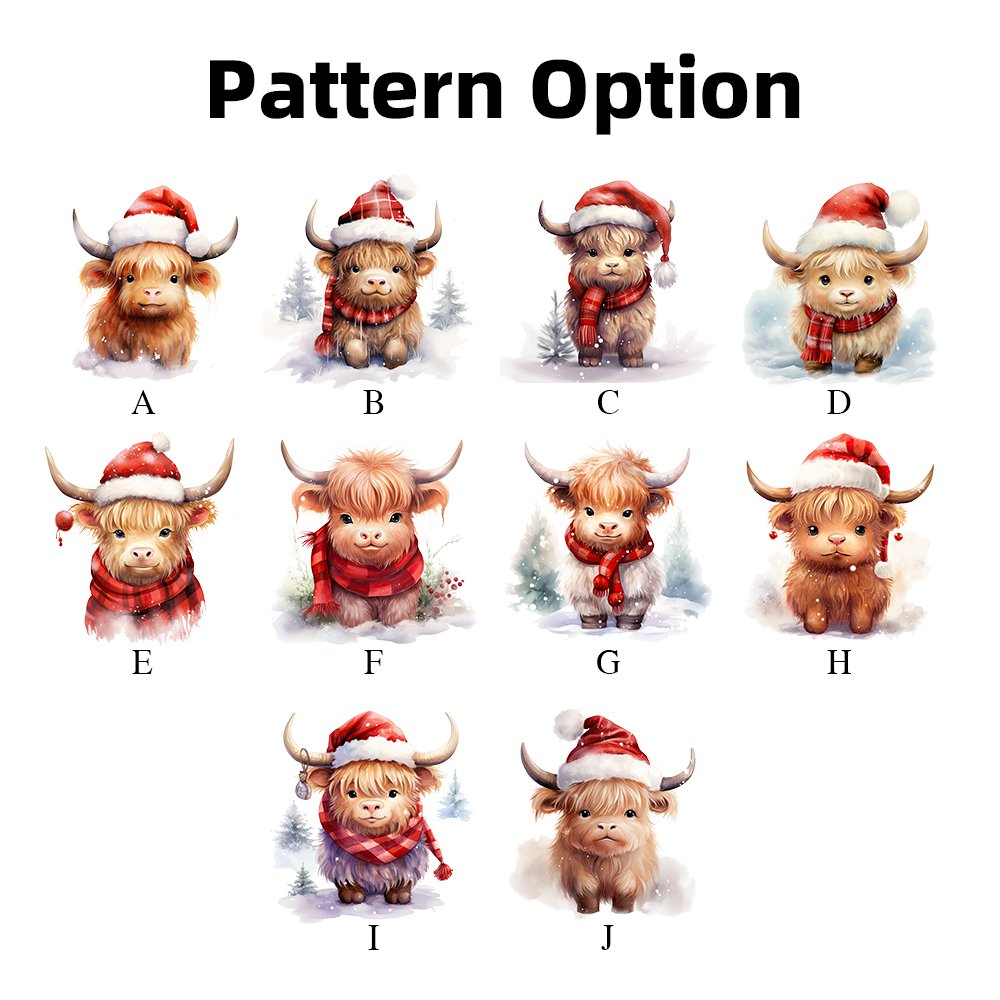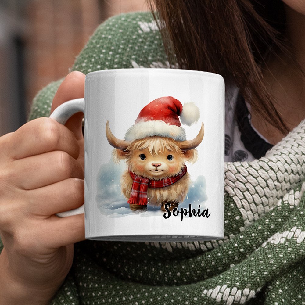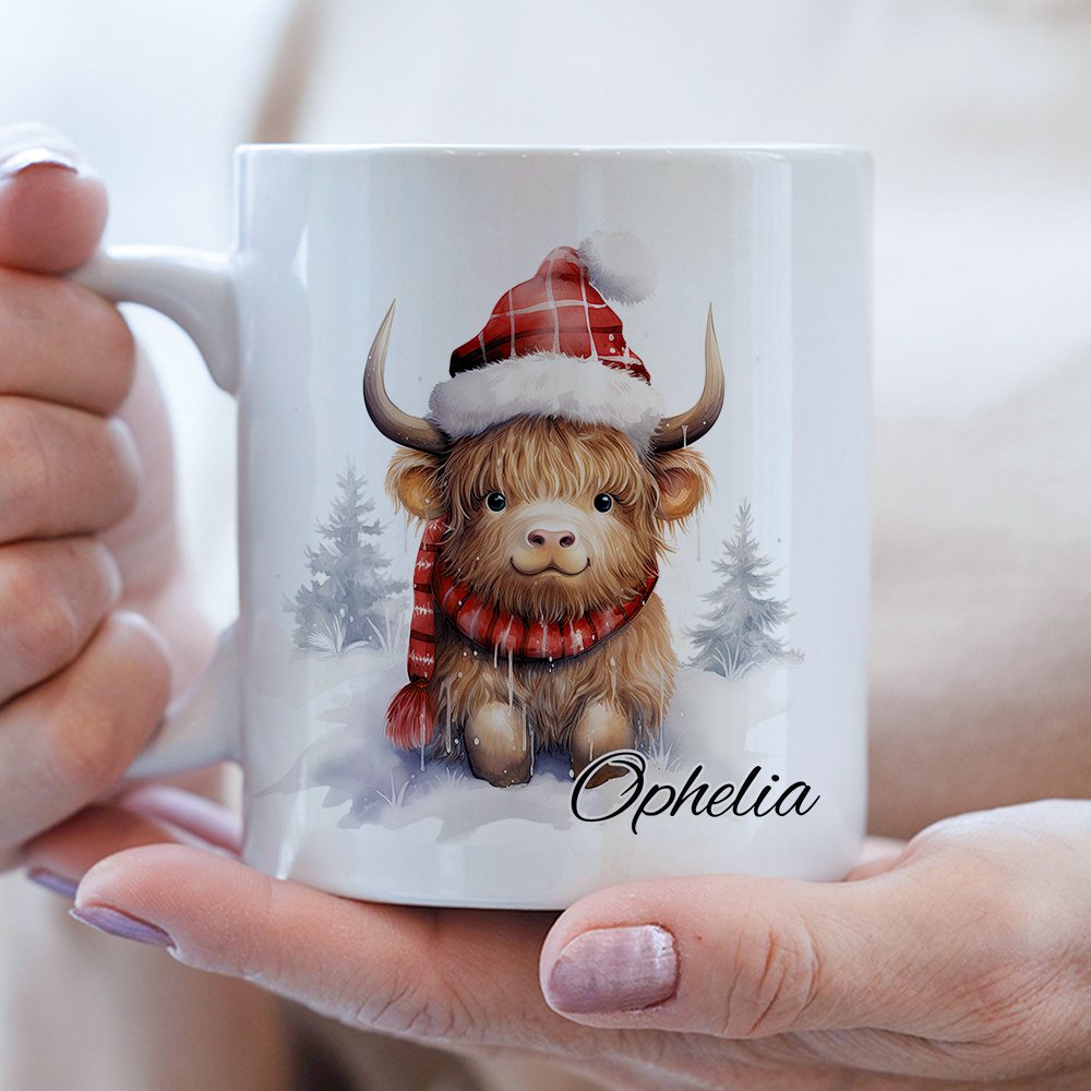 Christmas is coming, are you still worrying about what gift to buy? This Christmas highland cow mug uses a watercolor style highland cow with a cute Christmas hat to fit the Christmas atmosphere, and you can customize the mug with a name and your own highland cow cartoon pattern.