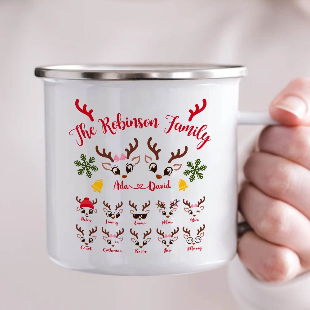 With two styles to choose from, a camping enamel mug or a ceramic mug, you can select the perfect option for your need. Both styles feature up to 12 adorable reindeer faces, each with your family members' names personalized underneath. The top of the mug can be customized with your family name, making it the perfect keepsake to treasure for years to come.