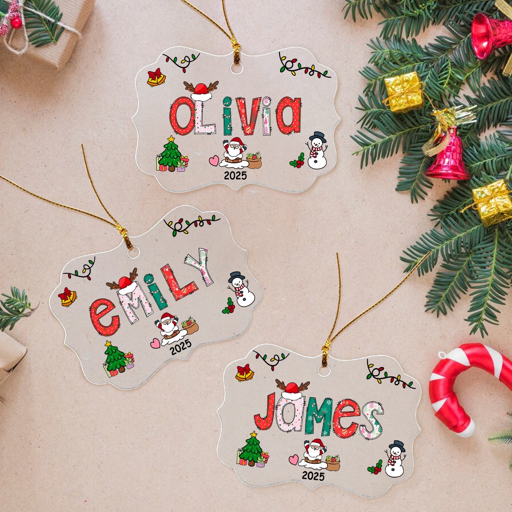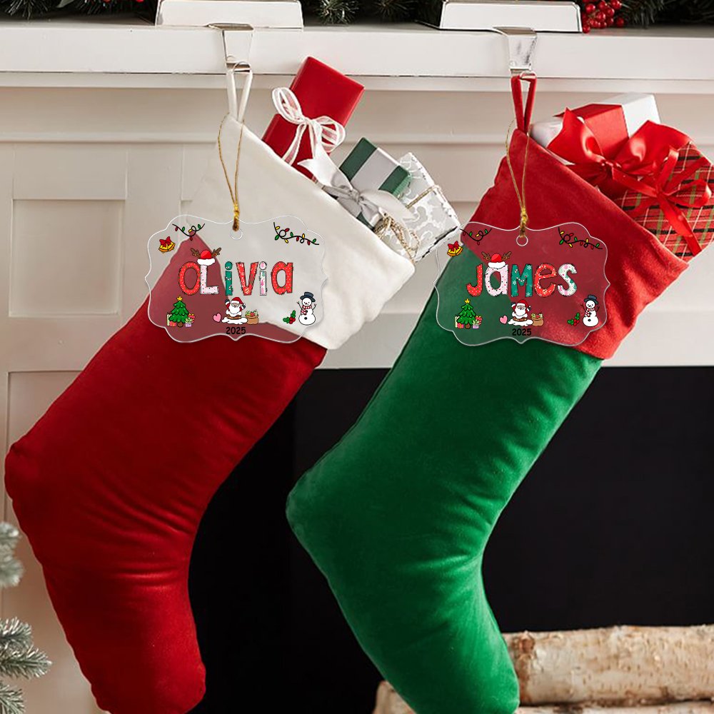 This ornament is based on the Christmas theme, combining elements such as Christmas trees, Santa Claus, snowmen, gifts, bells, etc., with a huge name in the middle, using classic and cute Christmas color fonts, warm and festive, creating a strong holiday atmosphere. Personalization options allow you to add your name and year, making this ornament a precious souvenir.