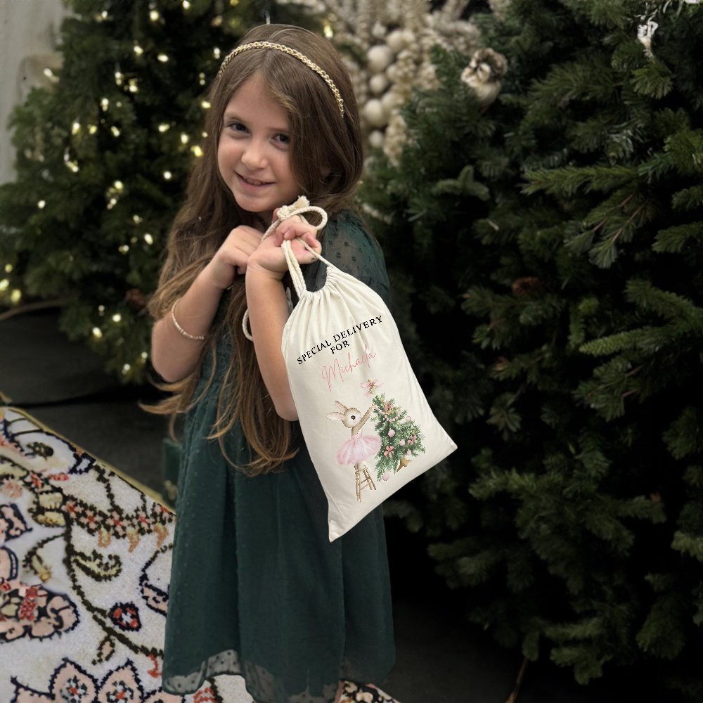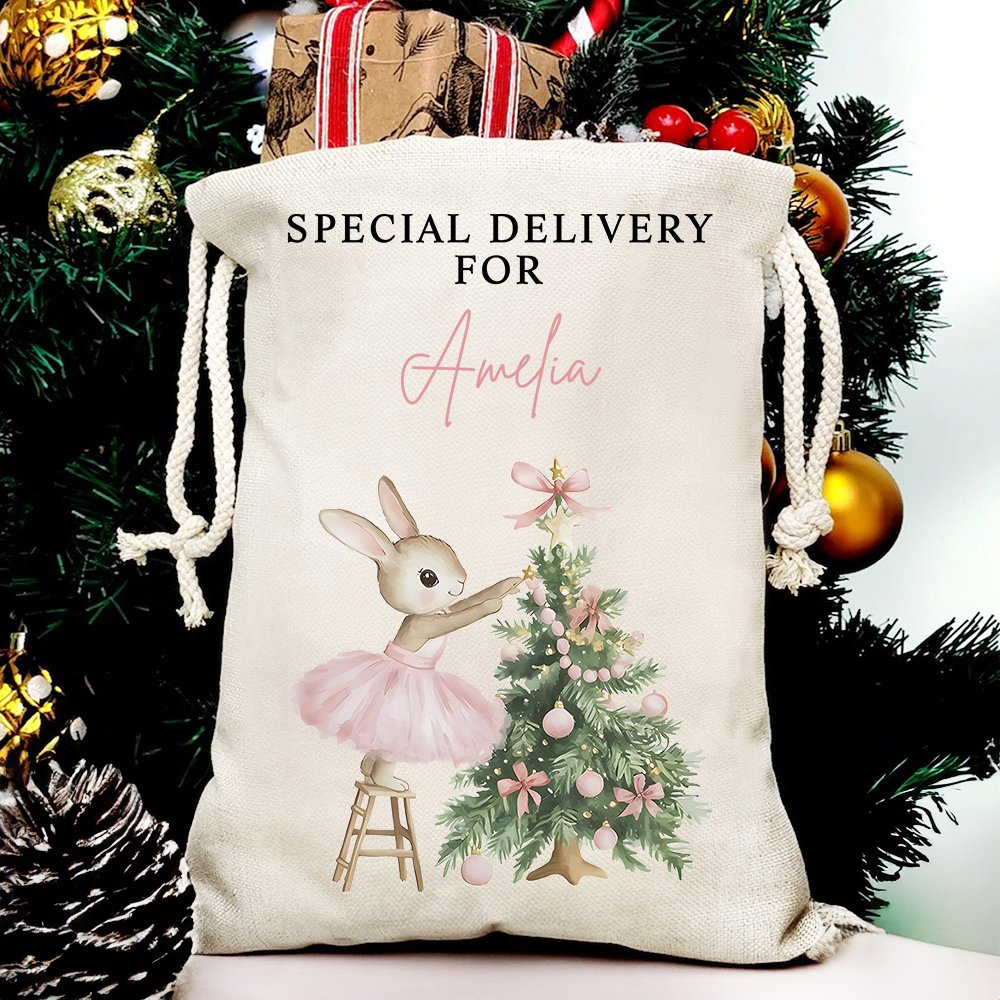 This Christmas bag features an adorable pink bunny and a Christmas tree theme, symbolizing childhood whimsy and festive gatherings. The bunny represents warmth and love, while the pink color conveys a cozy holiday atmosphere, perfectly aligning with the spirit of Christmas. You can also personalize the bag by adding a name, making this special occasion even more meaningful.