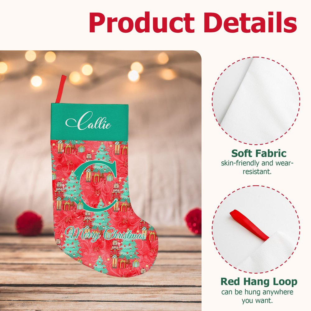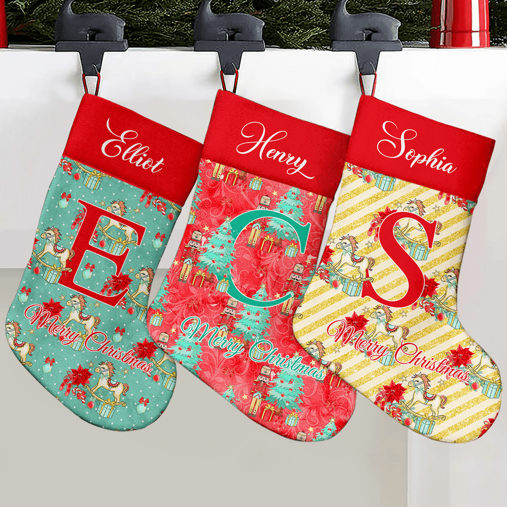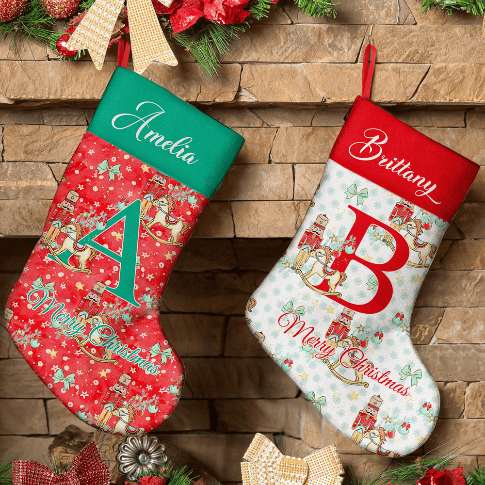 Featuring a retro and whimsical holiday theme, this Christmas stocking showcases classic patterns, including nutcrackers, rocking horses, Christmas trees, bows, and stars. Enchanting fairy tale-inspired illustrations transport you into a festive wonderland. Each stocking can be personalized with names and initials, and with ten distinctive designs to choose from, every gift bag becomes a one-of-a-kind holiday treasure.