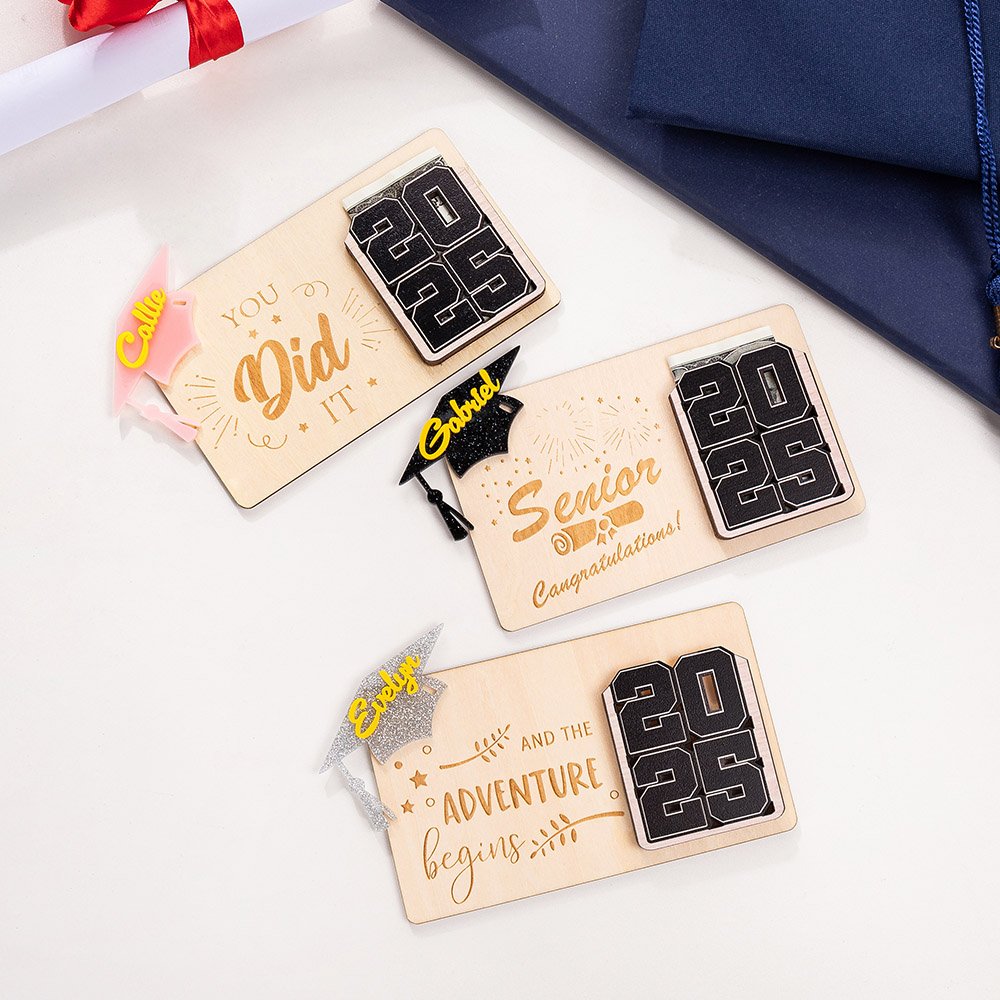 This money holder is made from high-quality basswood; the natural grain and warm tones add a rustic charm, while the smooth, polished finish gives it a sleek, modern appearance. The engraving and cutting process ensures a crisp, clear display of the graduate's name and class year, promising a long-lasting and cherished keepsake.