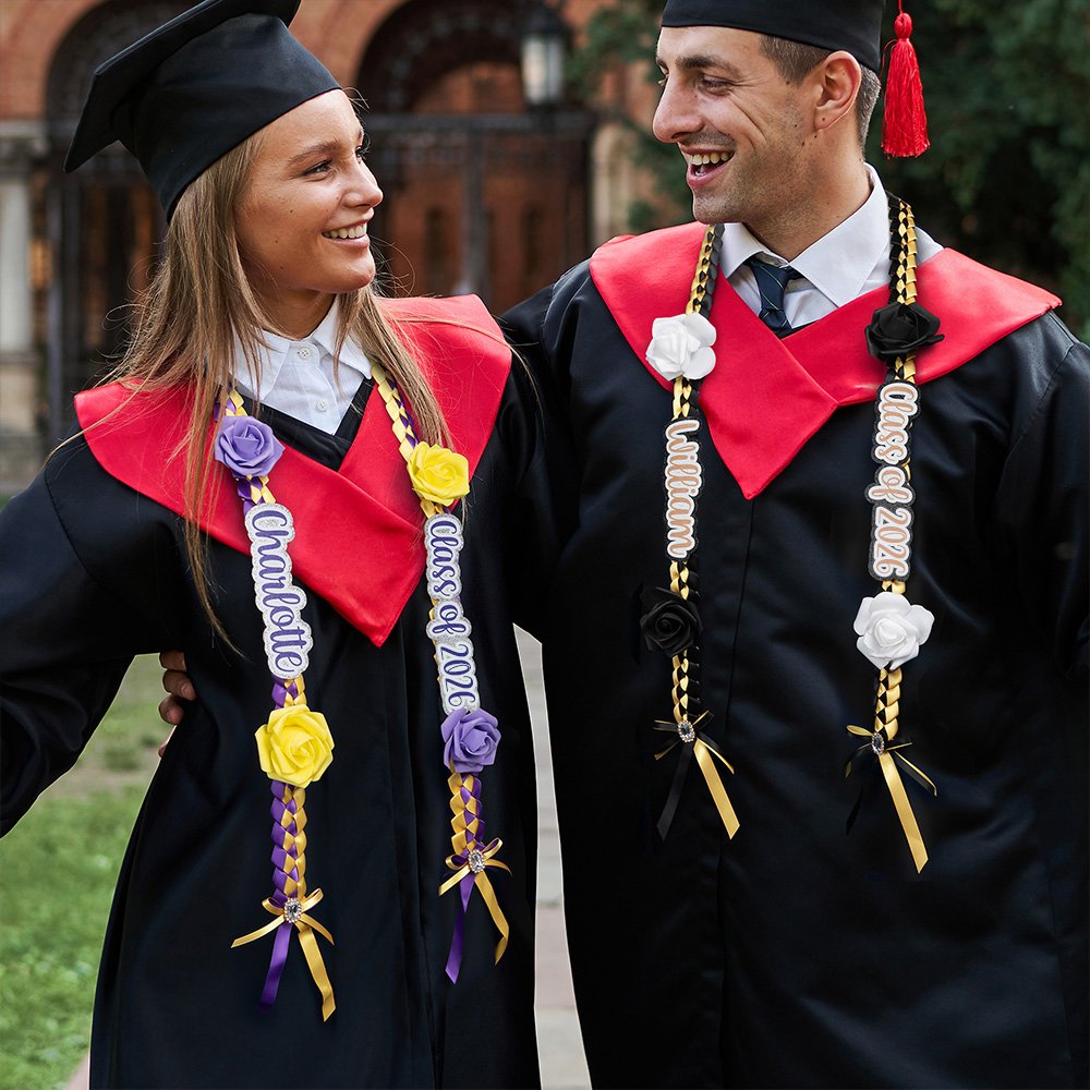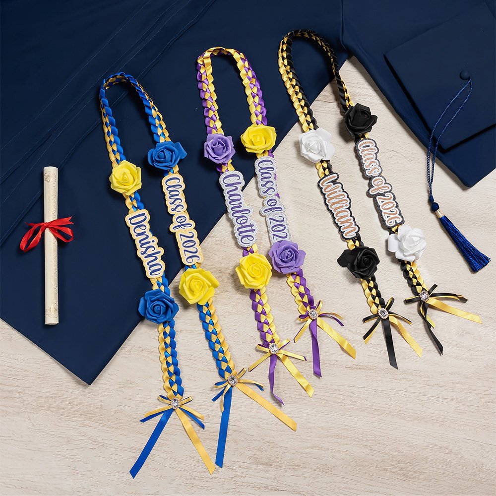 This graduation ribbon lei is intricately braided from two-color ribbons, creating a vibrant and eye-catching design. Elegant roses adorn both sides of the ribbon, while a rhinestone-studded bow at the bottom adds a touch of glamour and elegance. You can customize each side of the ribbon with a unique text on a glitter background, making it a highly recognizable personal statement at your graduation ceremony.