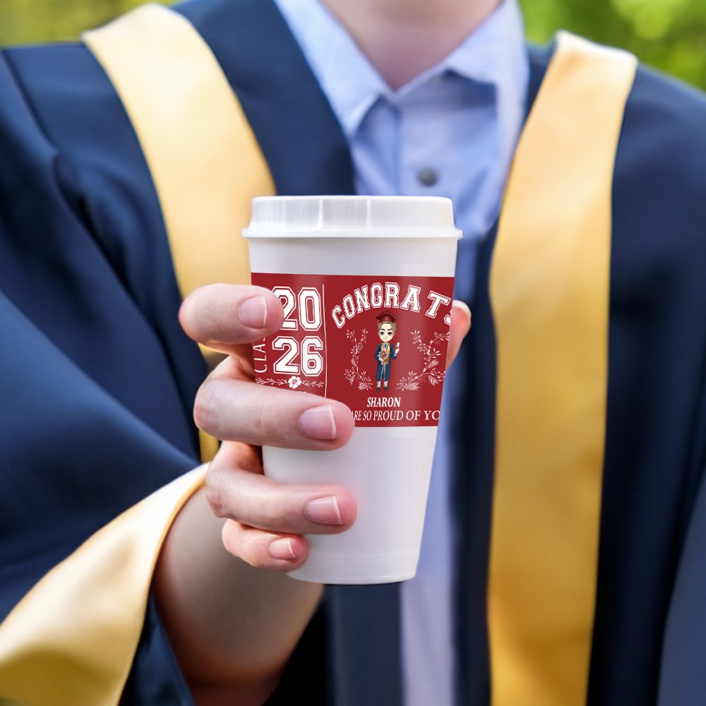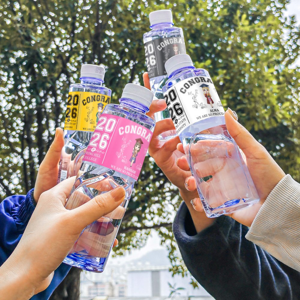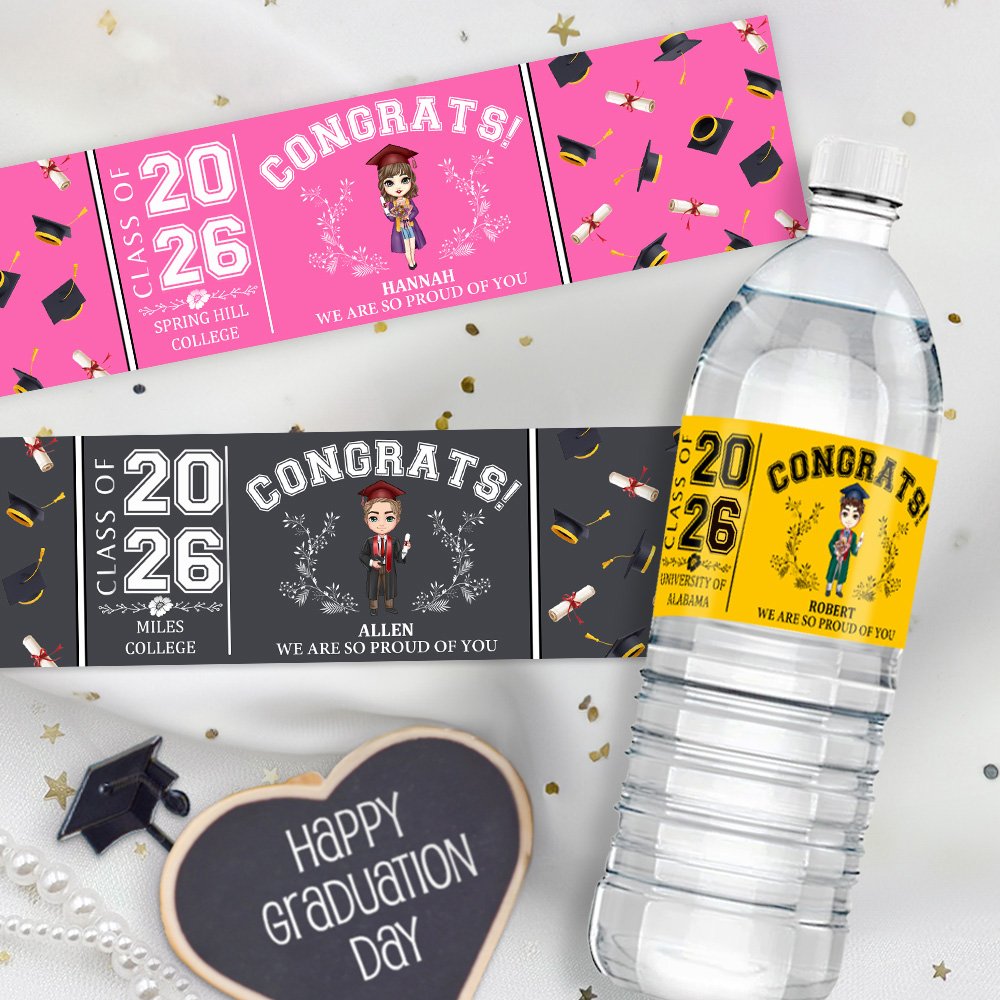 Make your graduation celebration truly special with our personalized water bottle labels! You can customize them with a unique cartoon graduate image that represents the graduate, along with their name, school, and graduation year, creating a one-of-a-kind keepsake that celebrates their achievement.