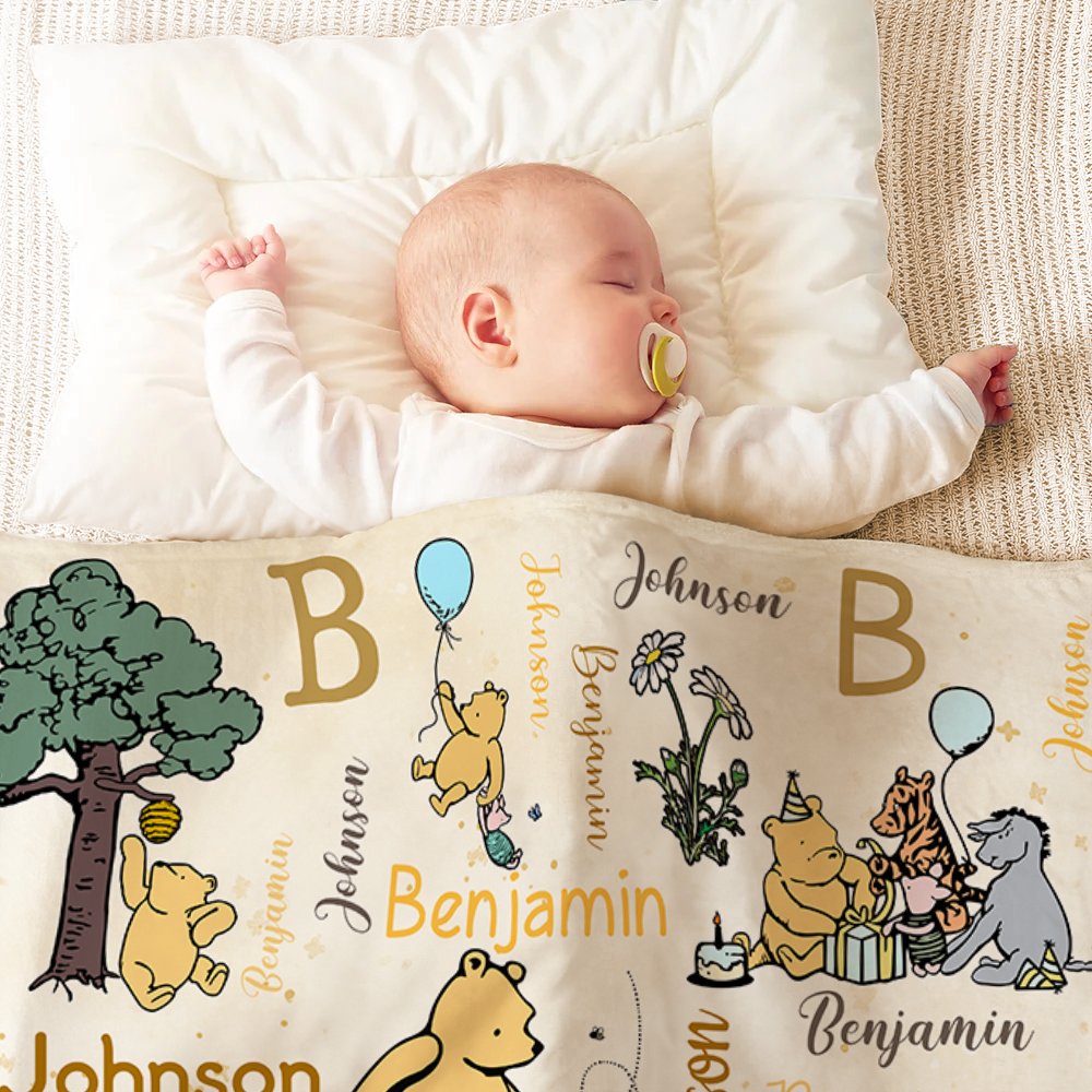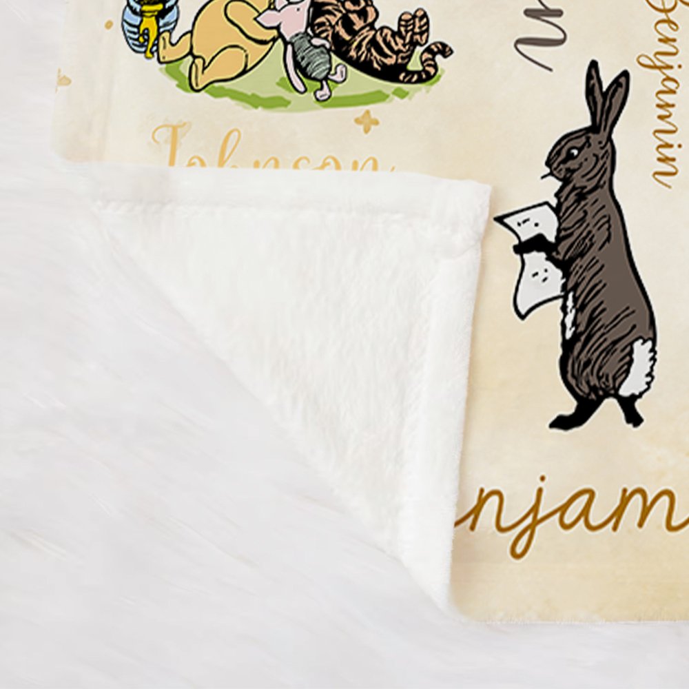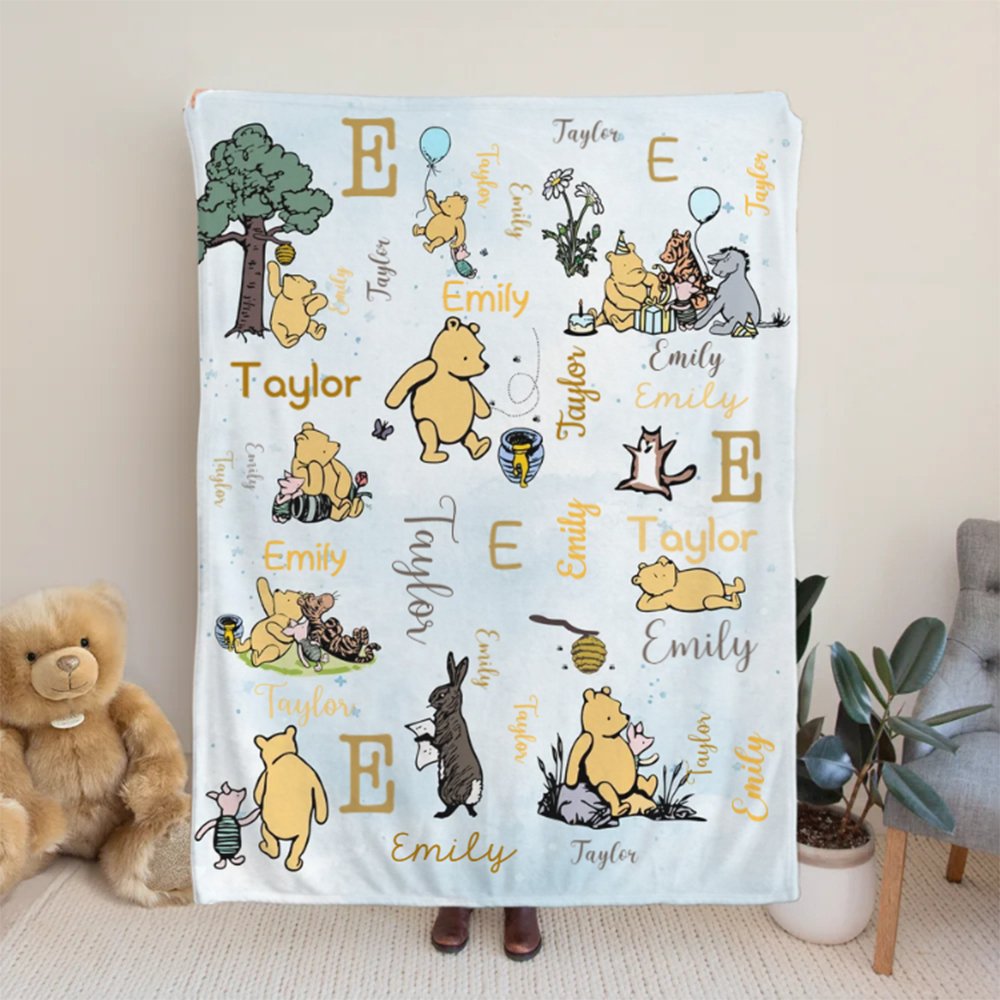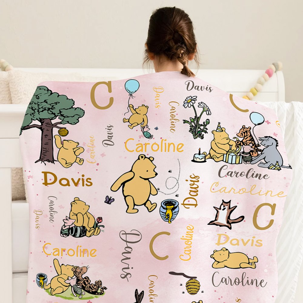 This soft throw blanket features an enchanting design of the classic Winnie-the-Pooh and his friends created by the renowned author A. A. Milne. The characters are depicted in their charming, timeless style, bringing a sense of nostalgia and warmth. What makes this blanket truly special is the personalized touch. It includes an initial name word cloud, allowing you to customize it with a name.