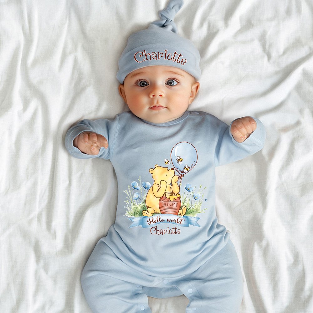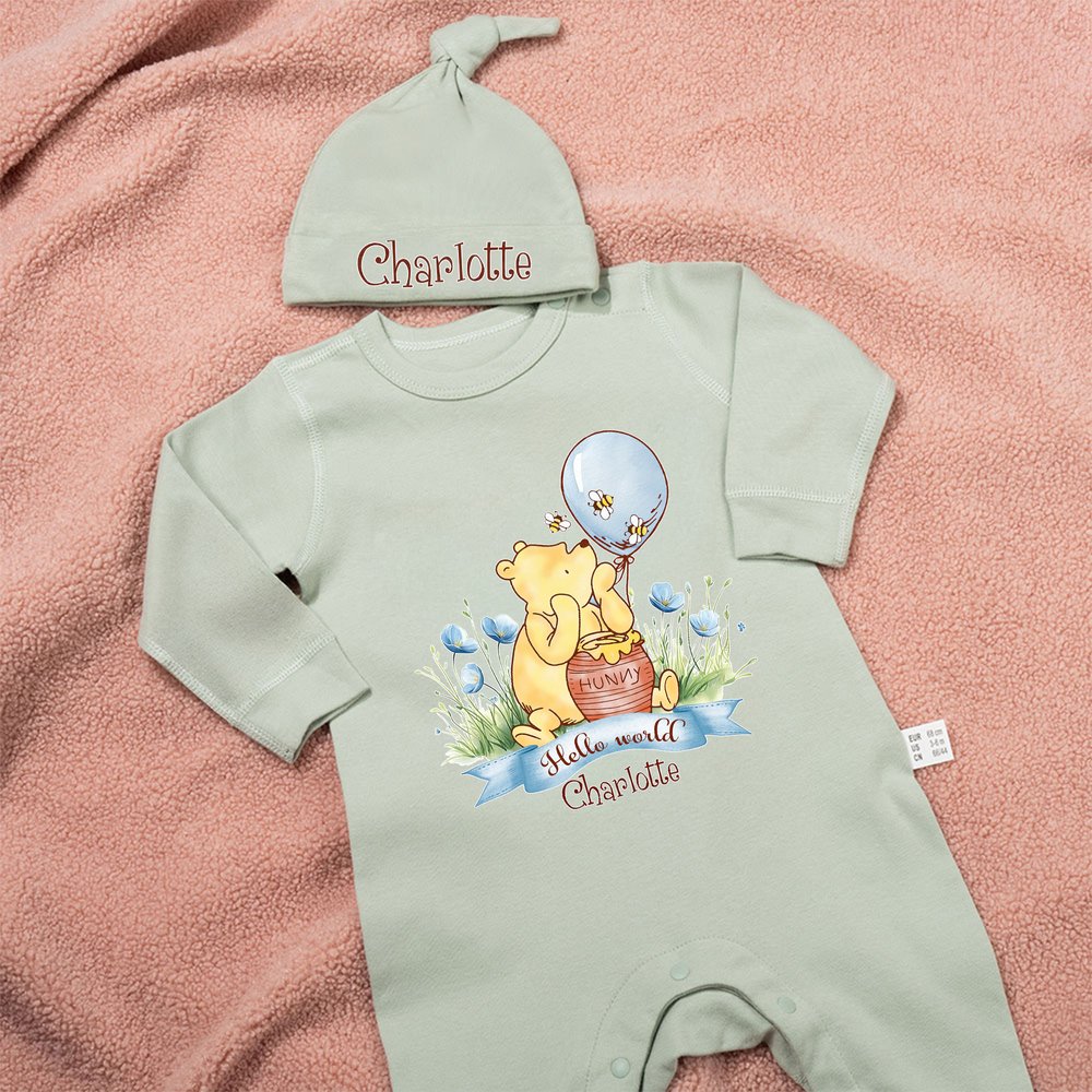 This adorable baby set features the beloved classic Winnie the Pooh, created by renowned author A.A. Milne, who has captured the hearts of generations. The design cleverly incorporates elements such as balloons, honey jars, flowers, and bees, paired with "Welcome baby/Hello world" slogans, perfectly showcasing a lively and energetic spirit. You can also personalize it with a name, making it an ideal choice for newborns.