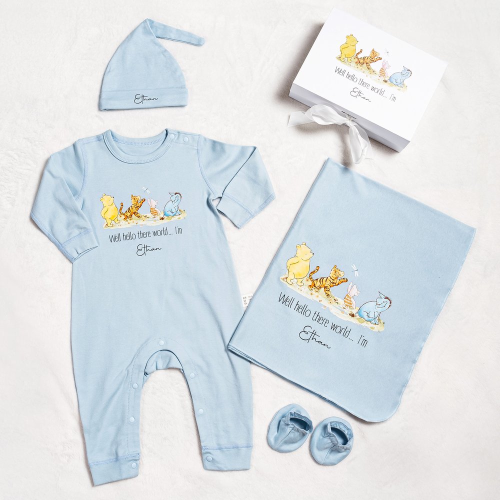 This adorable baby set features the beloved classic Winnie the Pooh, created by the renowned author A. A. Milne and has captured the hearts of generations. The design features a charming blend of pink, blue, and white hues, perfectly reflecting playful spirit and vibrancy, making it an excellent choice for newborn wear. There are a variety of sets to choose from.