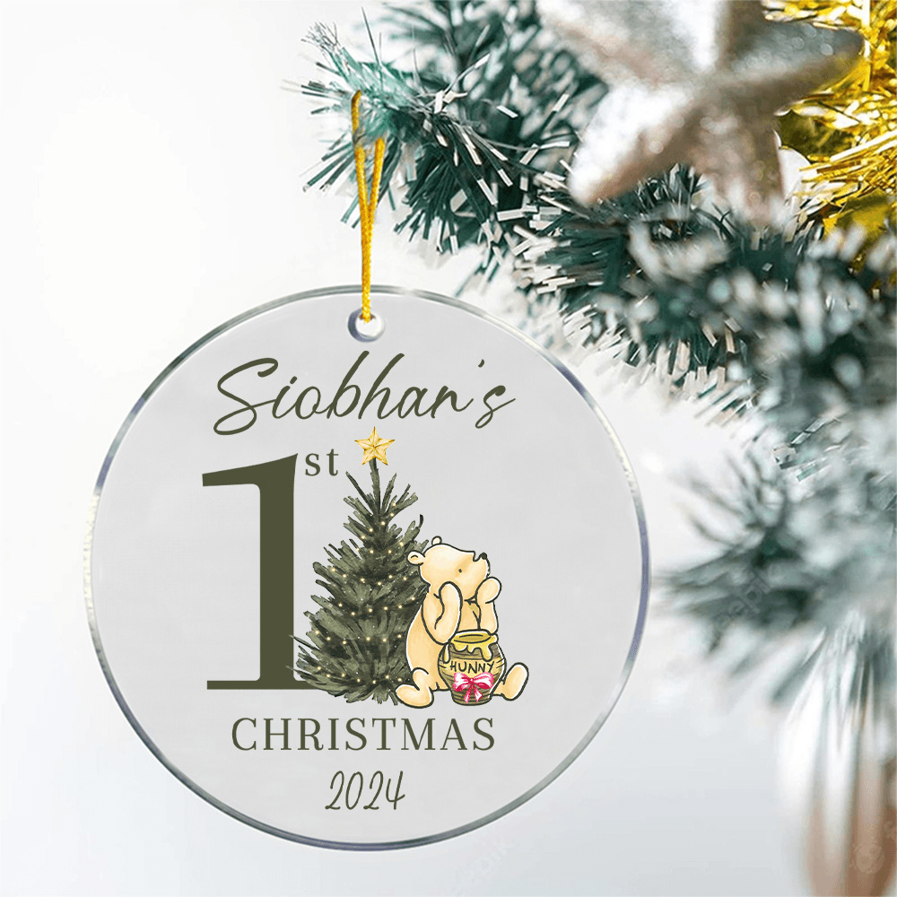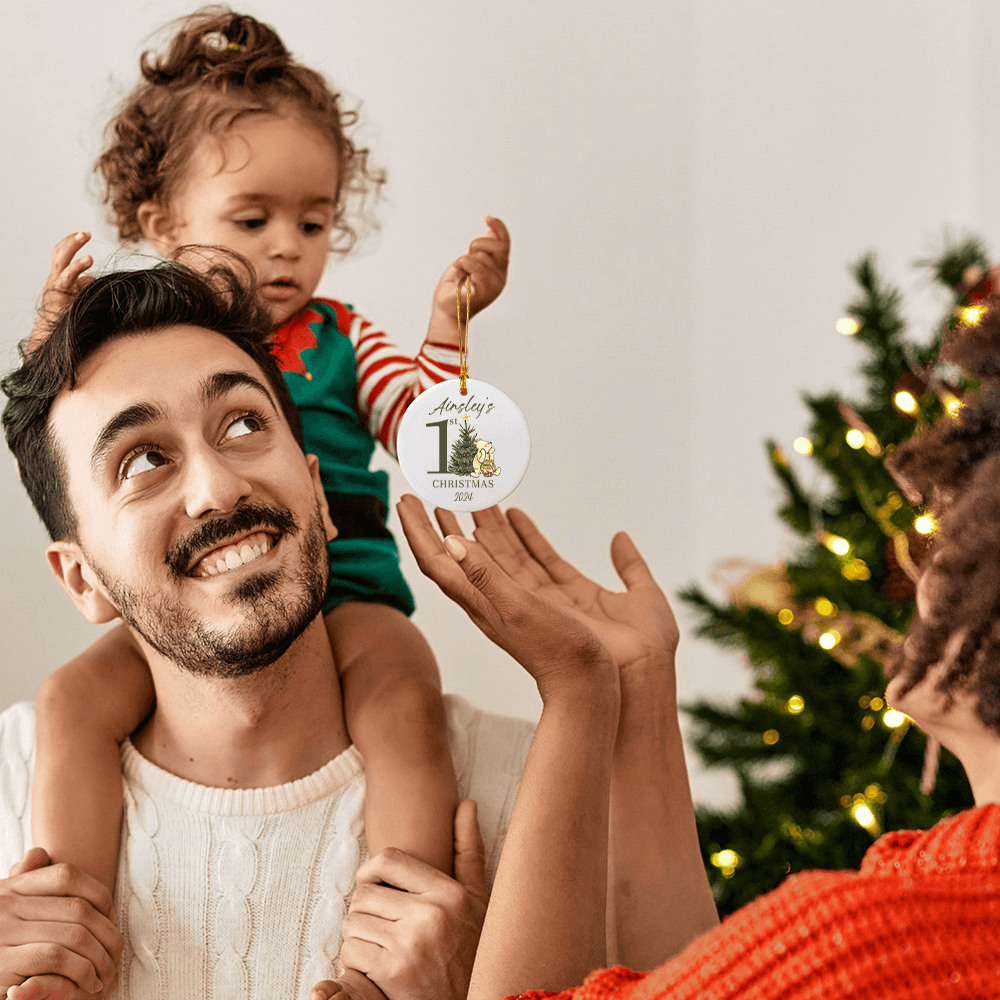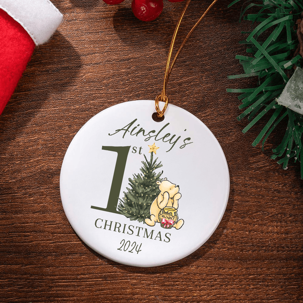 This ornament features classic Winnie the Pooh created by the renowned author A. A. Milne, a cute baby bear leaning against the Christmas tree to eat honey, warm and happy, with the slogan "First Christmas" to create a strong festive atmosphere. The personalization option allows you to add text to turn this ornament into a precious keepsake.