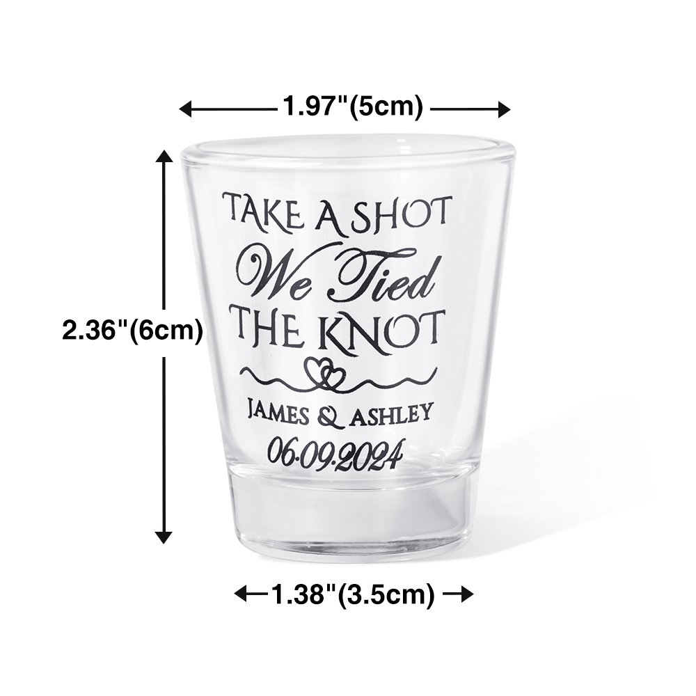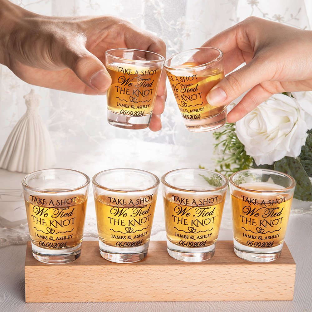 The message "Take A Shot We Tied the Knot" is beautifully printed on the shot glasses, reminding the couple of their everlasting love.