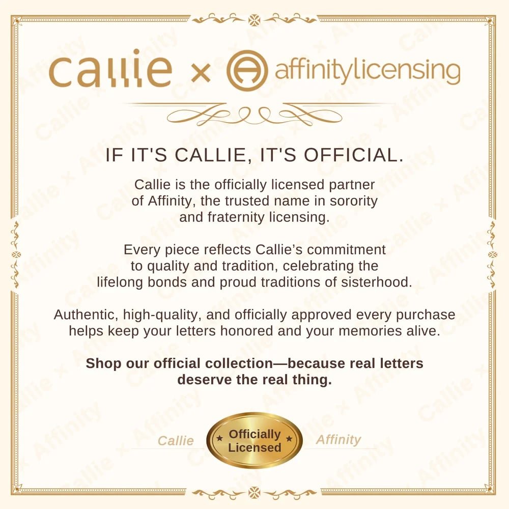 Callie is honored to offer officially licensed sorority products through our partnership with Affinity. This collaboration allows us to create high-quality items that celebrate the legacy and values of each sorority. With Affinity's trust, we proudly bring you products that embody true sisterhood, crafted with respect and care for every detail.