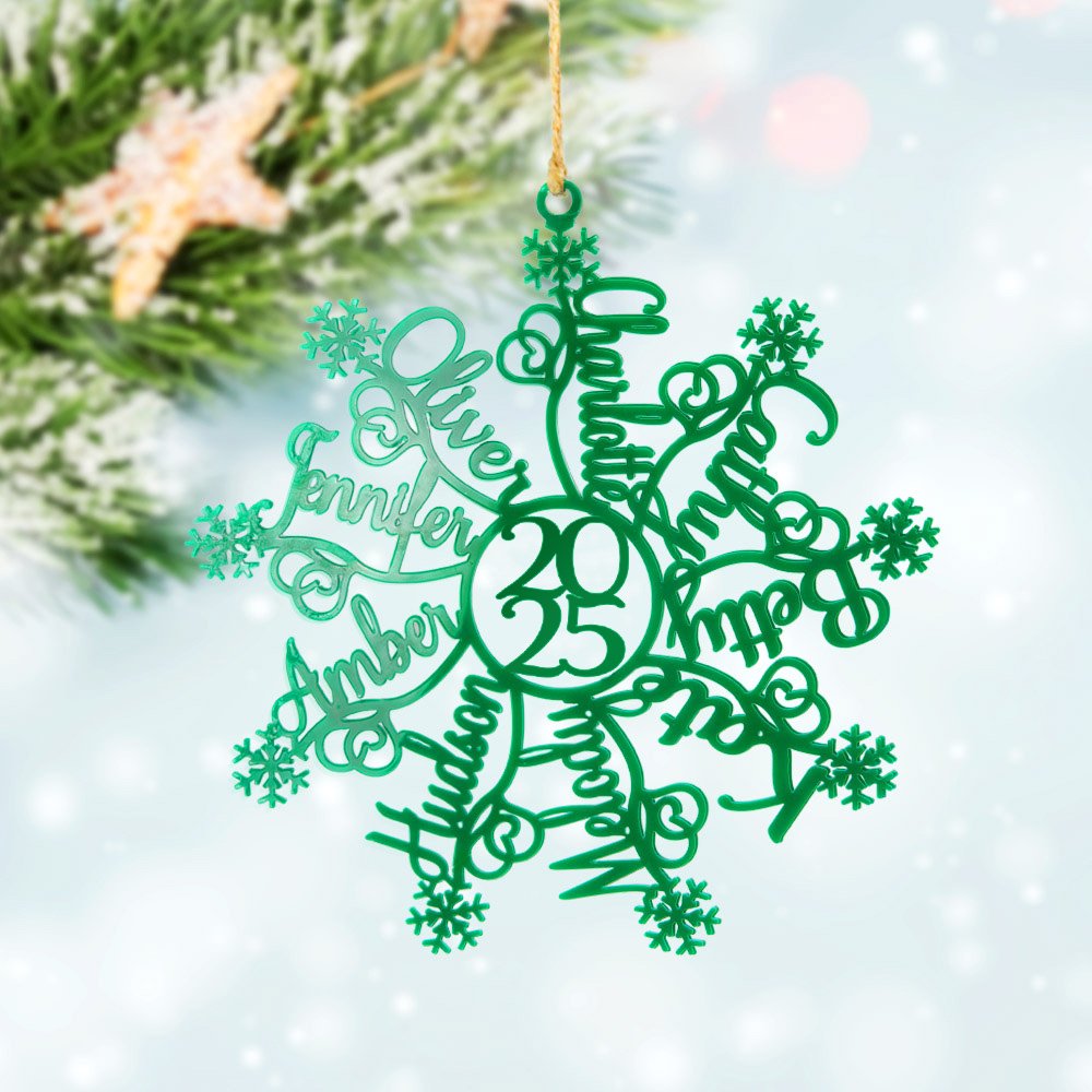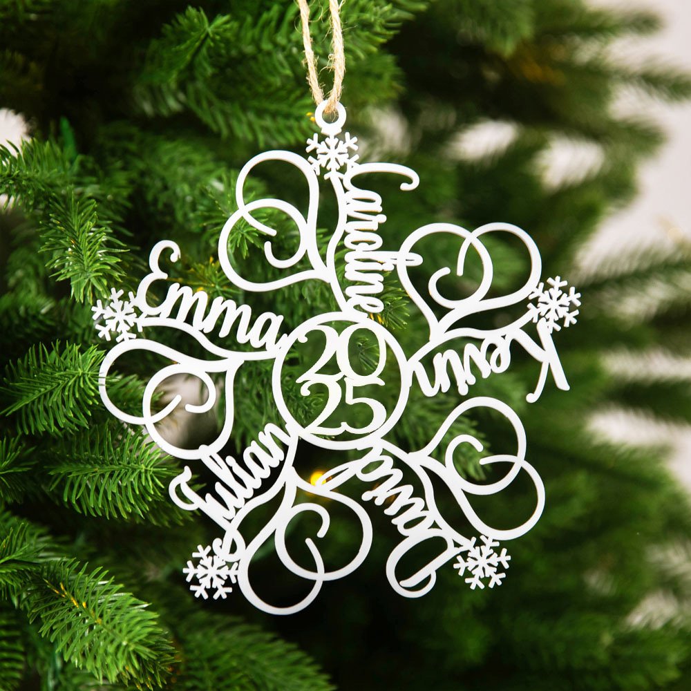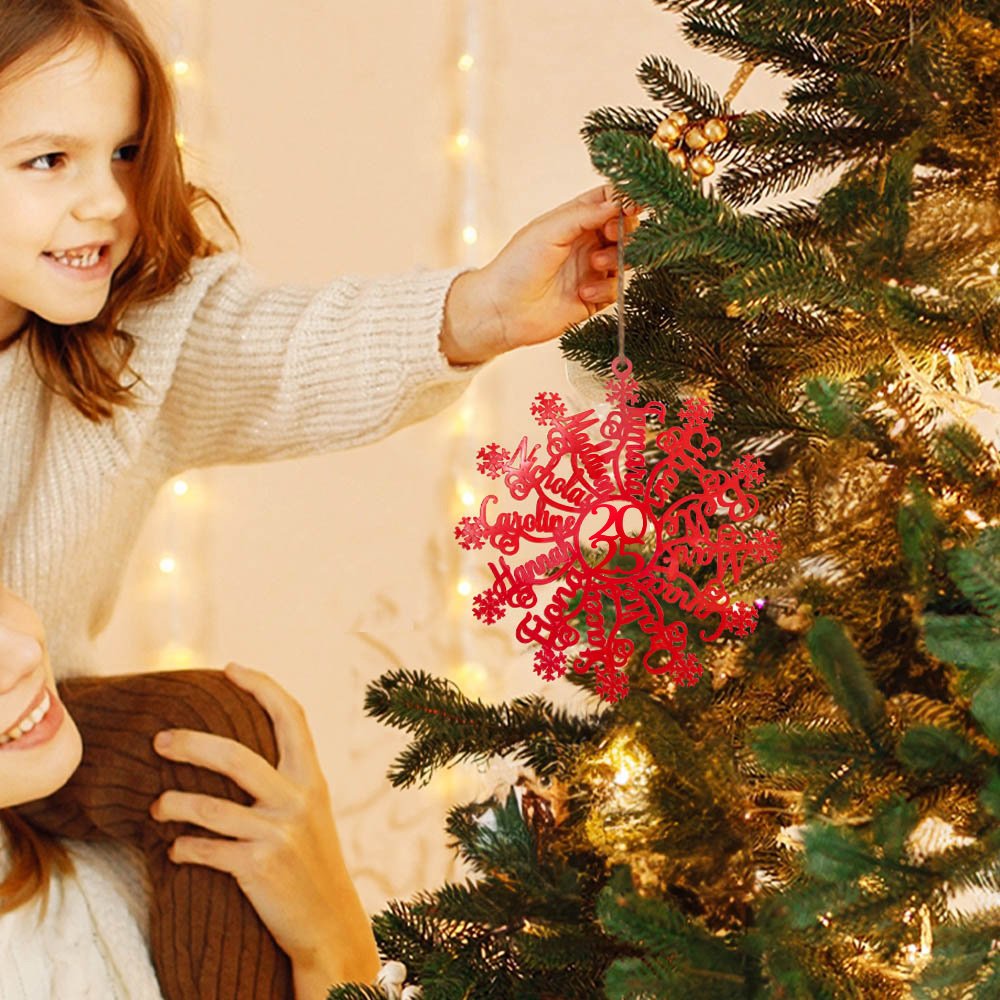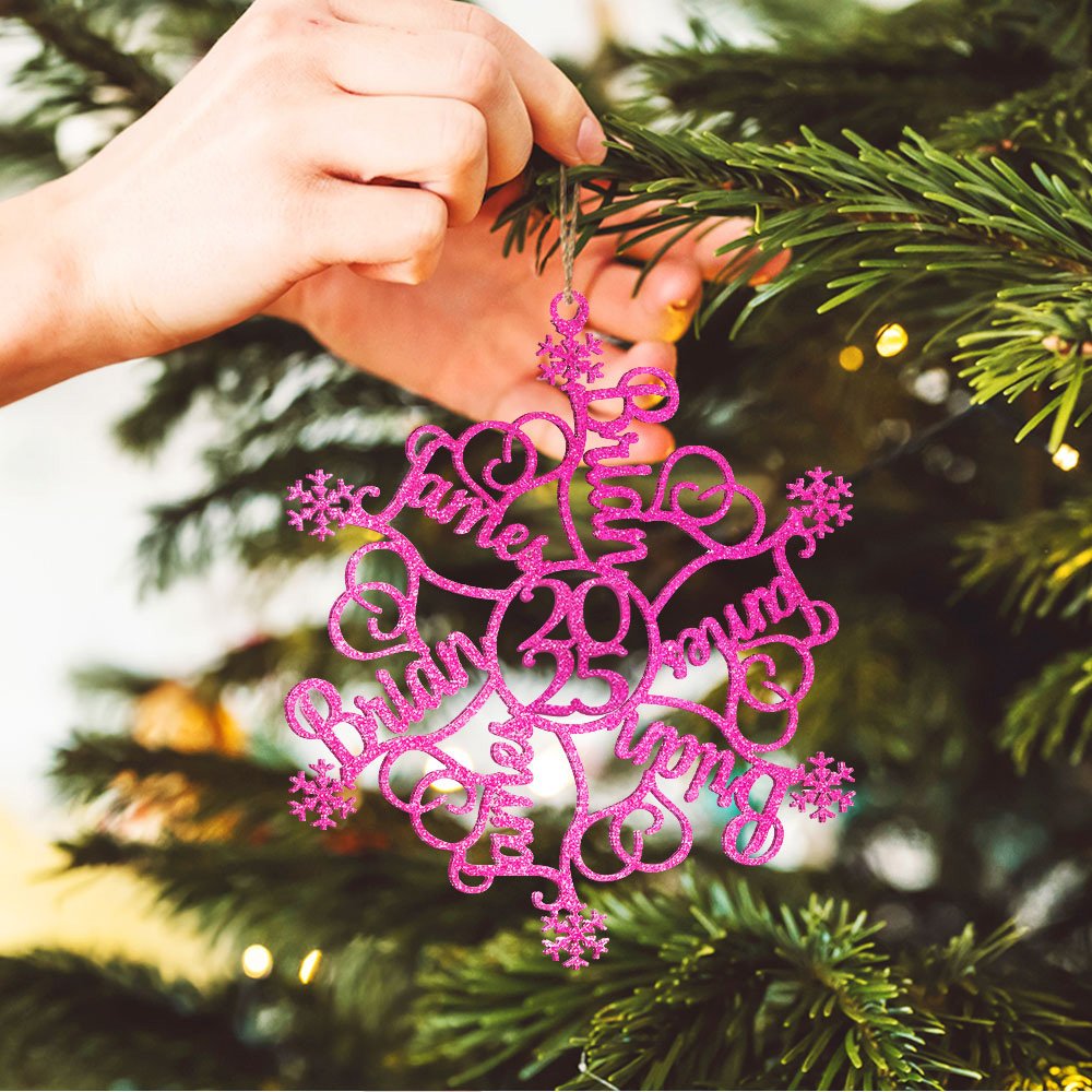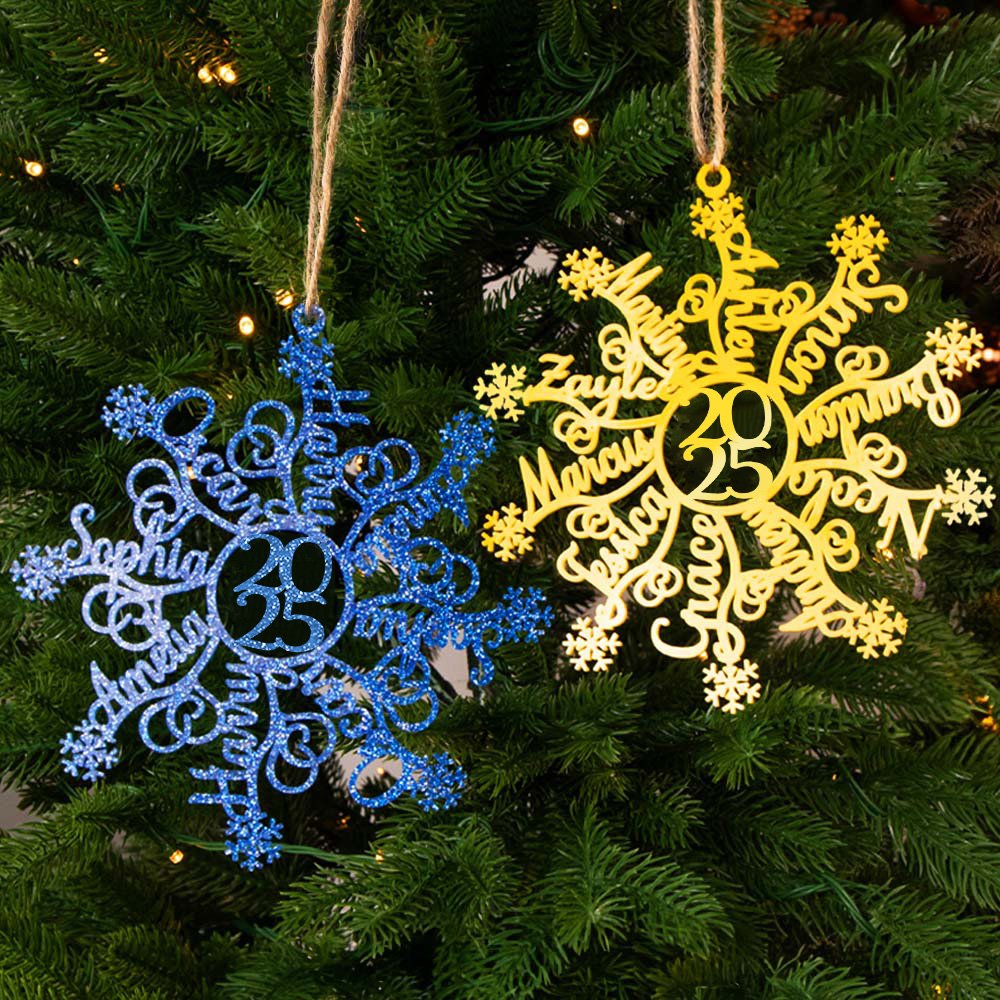 A beautiful snowflake pattern accommodates 1-12 personalized names, creating a unique family keepsake. Each snowflake is uniquely designed for individual names. It is available in nine vibrant acrylic colors. Personal year marking adds a meaningful touch. The multi-color acrylic material captures light beautifully while harmonizing each family member's name.