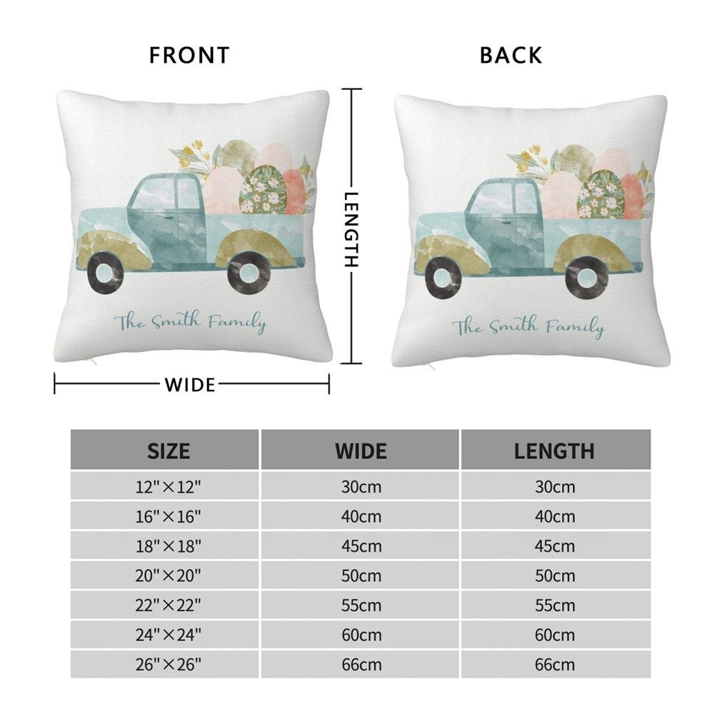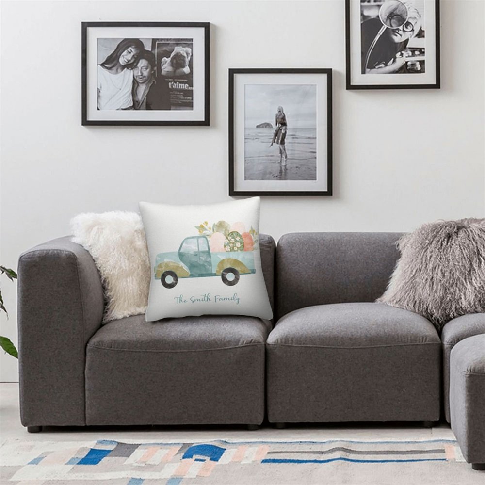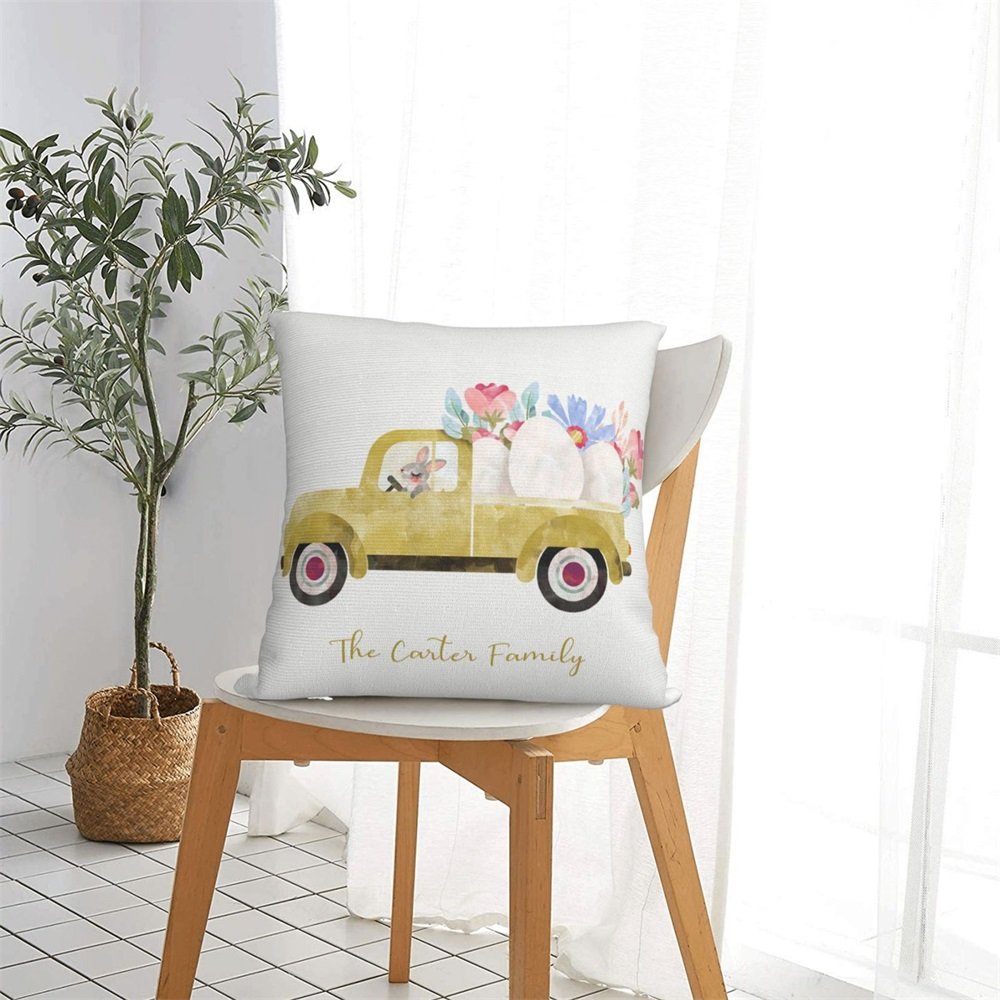 Our throw pillow cover showcases a vibrant and lively scene of a truck loaded with Easter eggs or carrots, creating an eye-catching and playful atmosphere.