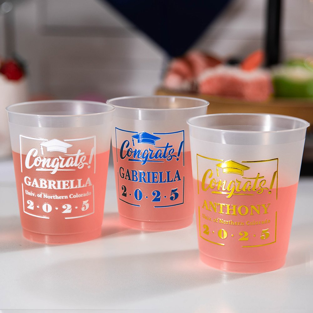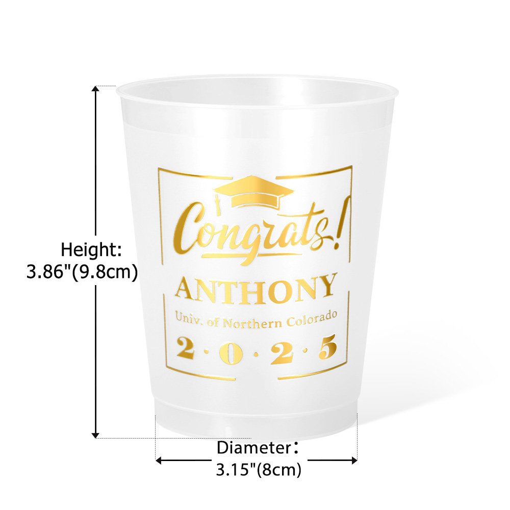 These frosted graduation cups feature a stylish design that includes graduation caps, geometric shapes, and the word "Congrats." You can personalize each cup with the graduate's name, graduation year, and school, making them a unique and memorable addition to any graduation party.