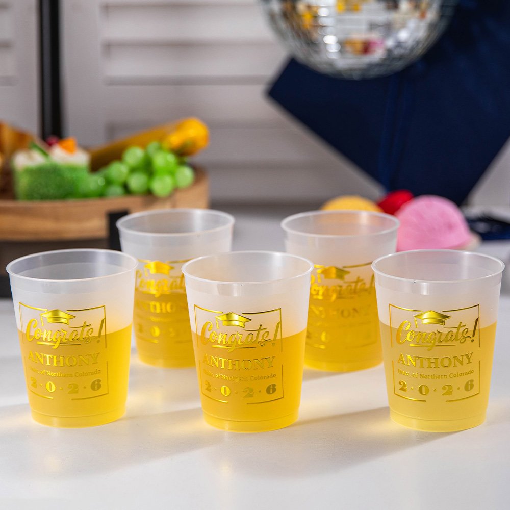 These frosted graduation cups feature a stylish design that includes graduation caps, geometric shapes, and the word "Congrats." You can personalize each cup with the graduate's name, graduation year, and school, making them a unique and memorable addition to any graduation party.