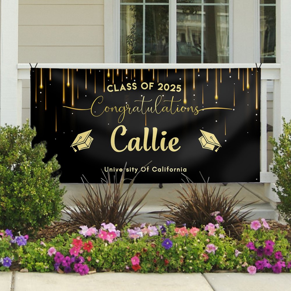 This banner stands out with its trendy graduation hat design, blending creativity with practicality. The “CONGRATULATIONS!” wording is prominent and fitting for the graduation season. More importantly, we offer four distinct styles, and you can customize names and school names to make a unique banner.