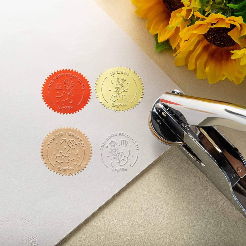 Our book embossing stamp combines the ancient allure of zodiac signs with the timeless grace of birth flowers. Every line and curve is carefully etched to create a stunning, raised impression on the pages of your favorite books. The book embosser tool allows you to beautifully emboss the recipient's name onto a page or foil, creating a one-of-a-kind mark on your treasured collection.