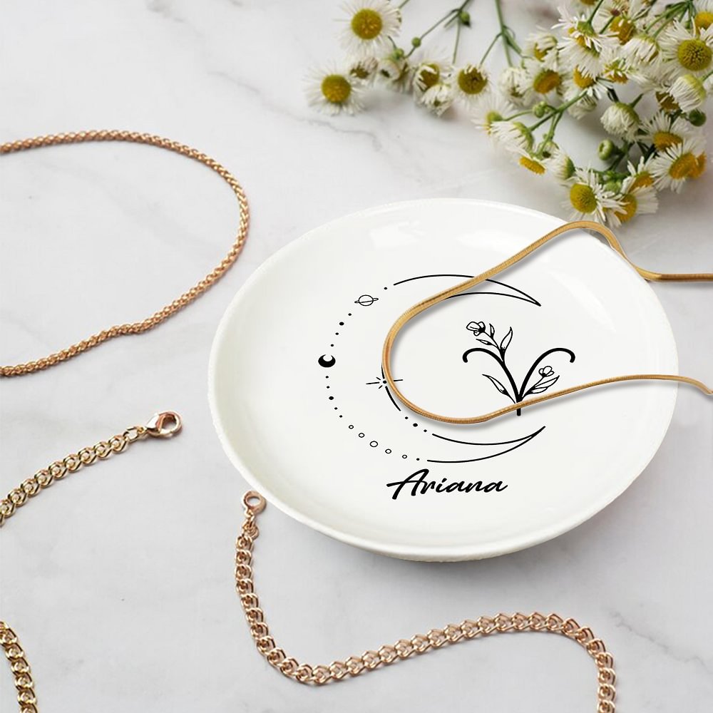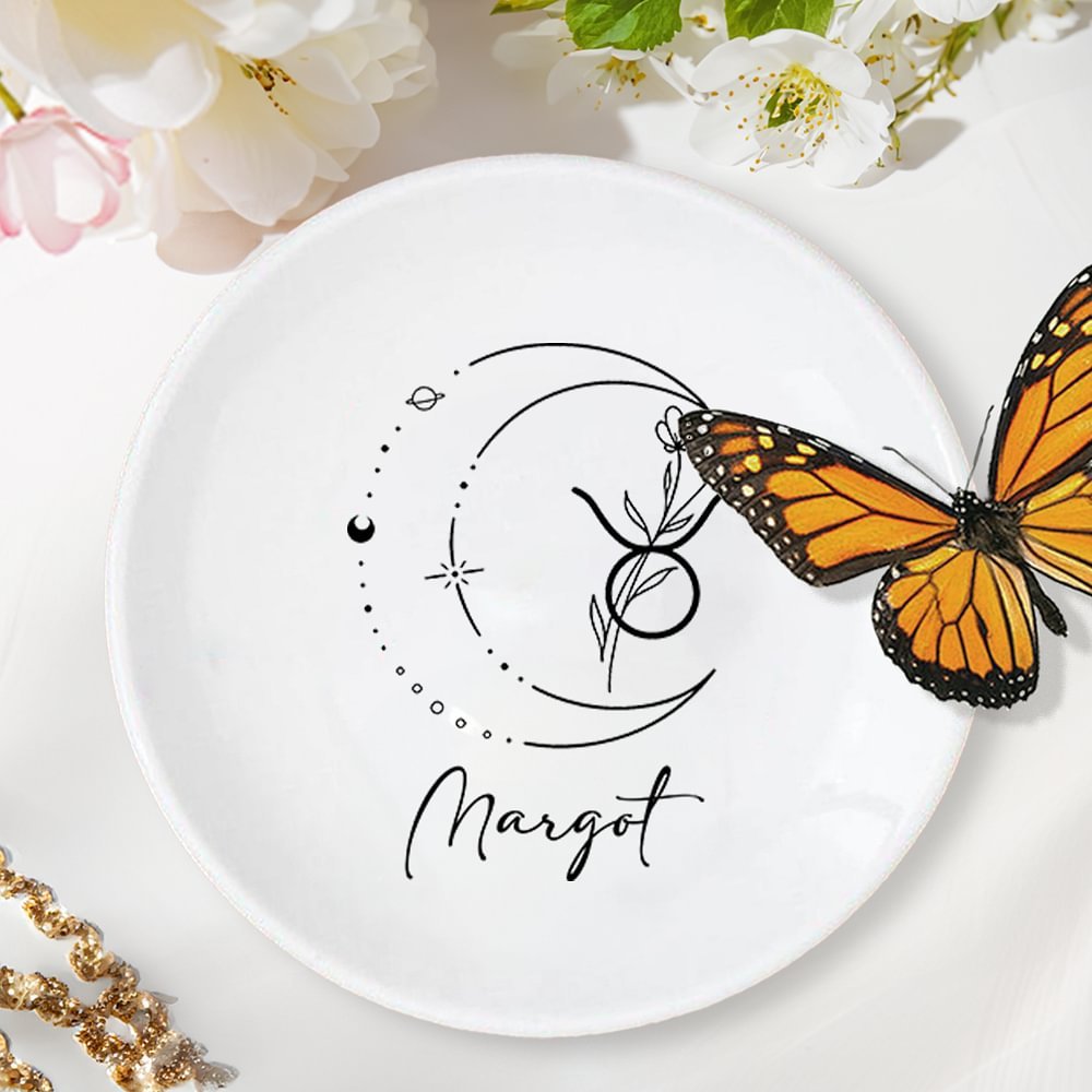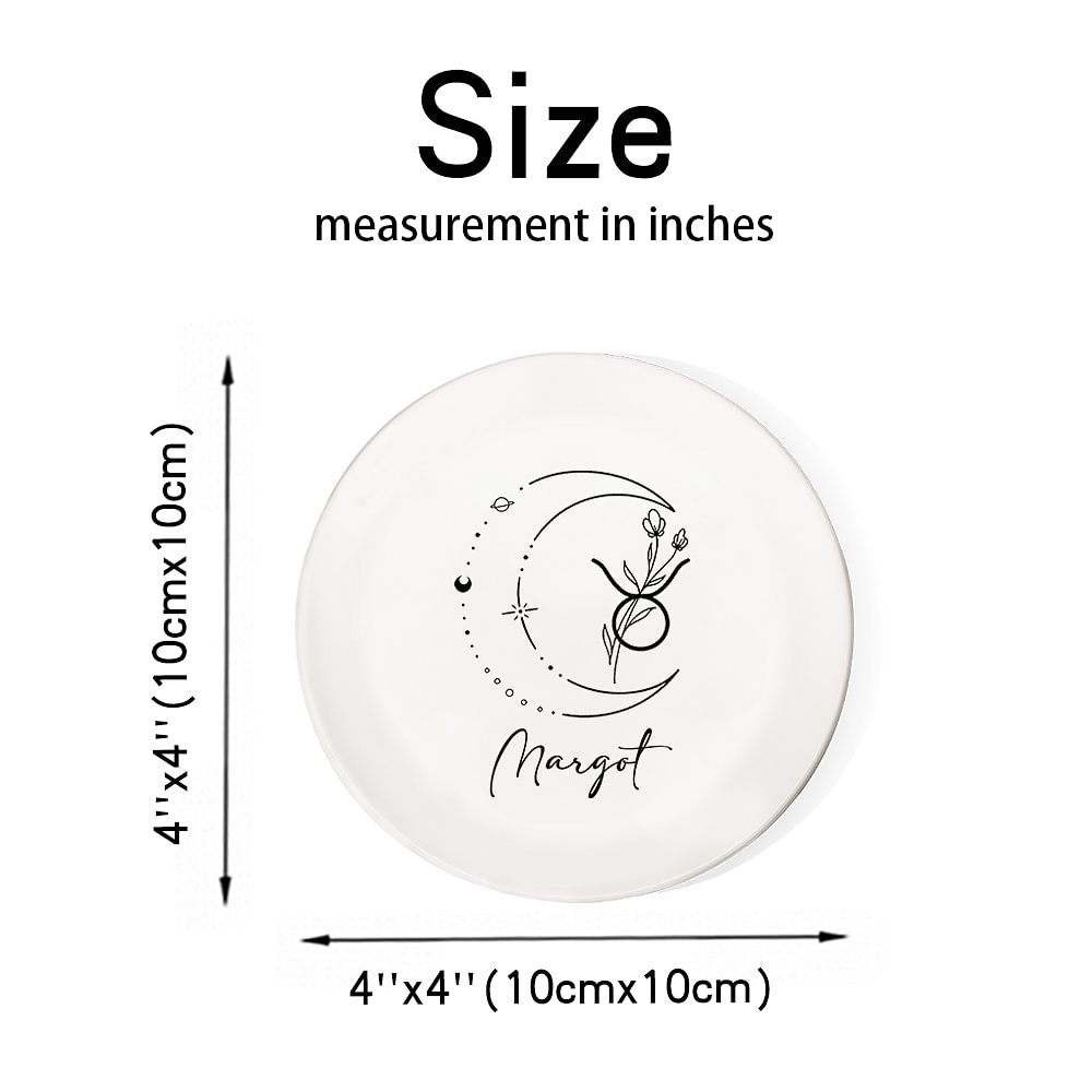This round ceramic jewelry dish is uniquely personalized with your name and zodiac sign, making it a thoughtful and meaningful keepsake. Perfect for showcasing your astrological identity, it’s a one-of-a-kind gift that adds a personal touch to any occasion.