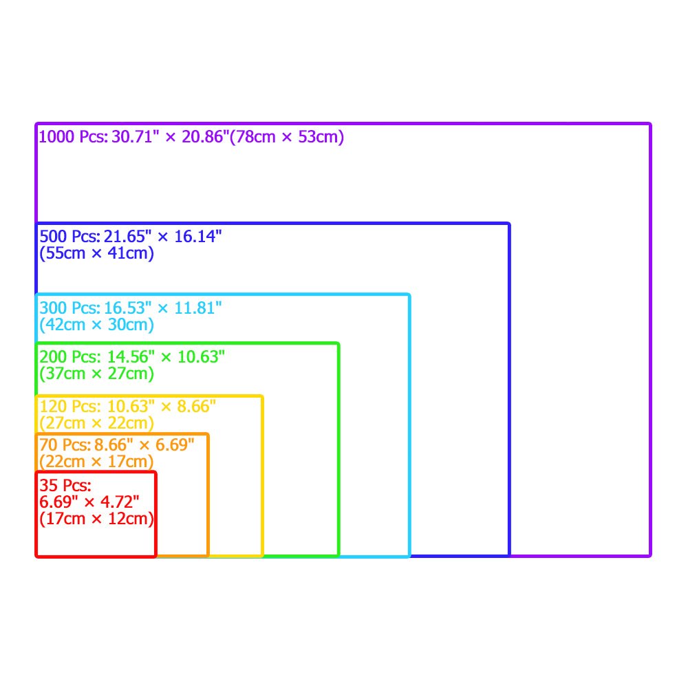 | Measurement: | 35 Pcs - 6.69" × 4.72"(17cm × 12cm) 70 Pcs - 8.66" × 6.69"(22cm × 17cm) 120 Pcs - 10.63" × 8.66"(27cm × 22cm) 200 Pcs - 14.56" × 10.63"(37cm × 27cm) 300 Pcs - 16.53" × 11.81"(42cm × 30cm) 500 Pcs - 21.65" × 16.14"(55cm × 41cm) 1000 Pcs - 30.71" × 20.86"(78cm × 53cm) |