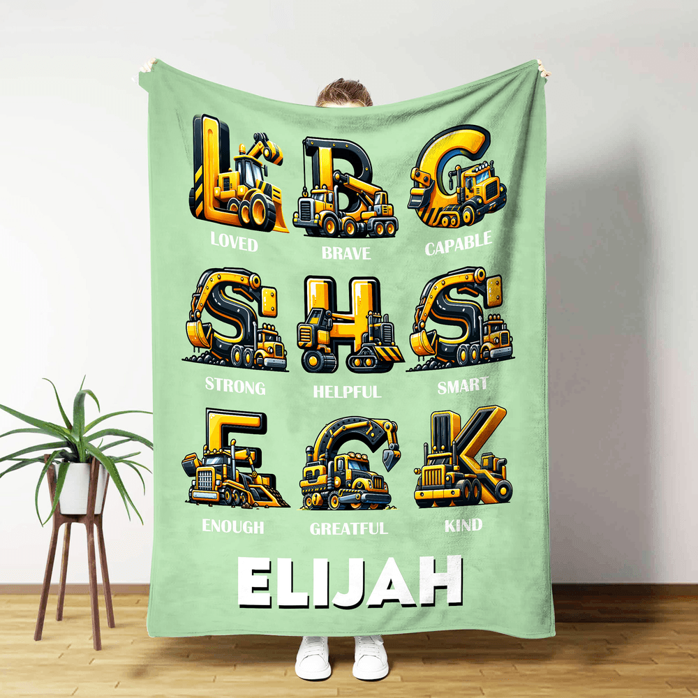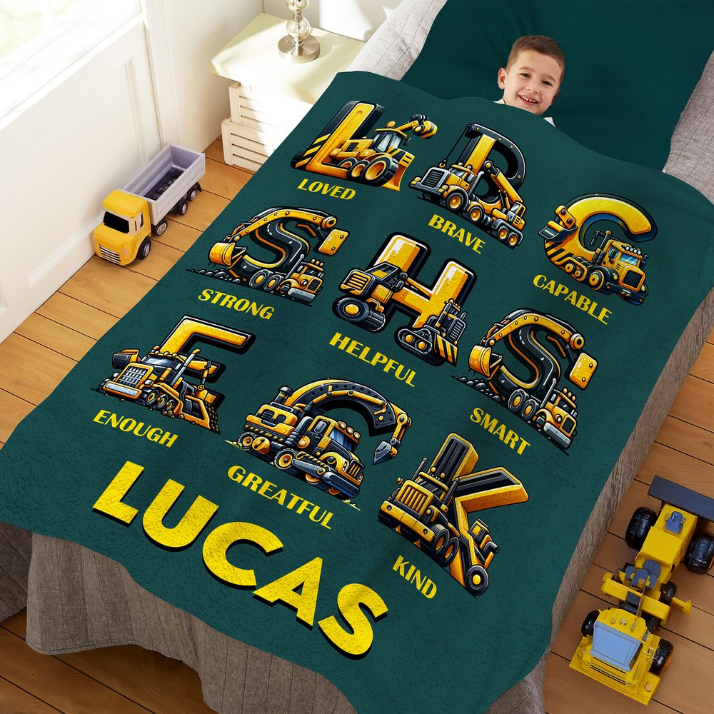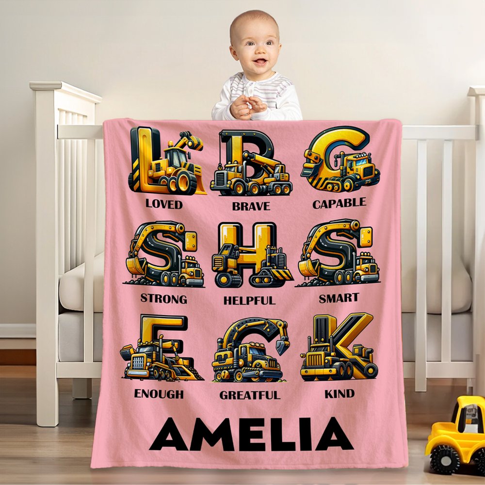 Designed for construction vehicle enthusiasts and energetic boys, this blanket cleverly incorporates various construction vehicles and initials. You can prominently print your child's name, initials, or a short greeting in the center, making it a one-of-a-kind blanket. Available in 20 colors to suit your child's preferences.
