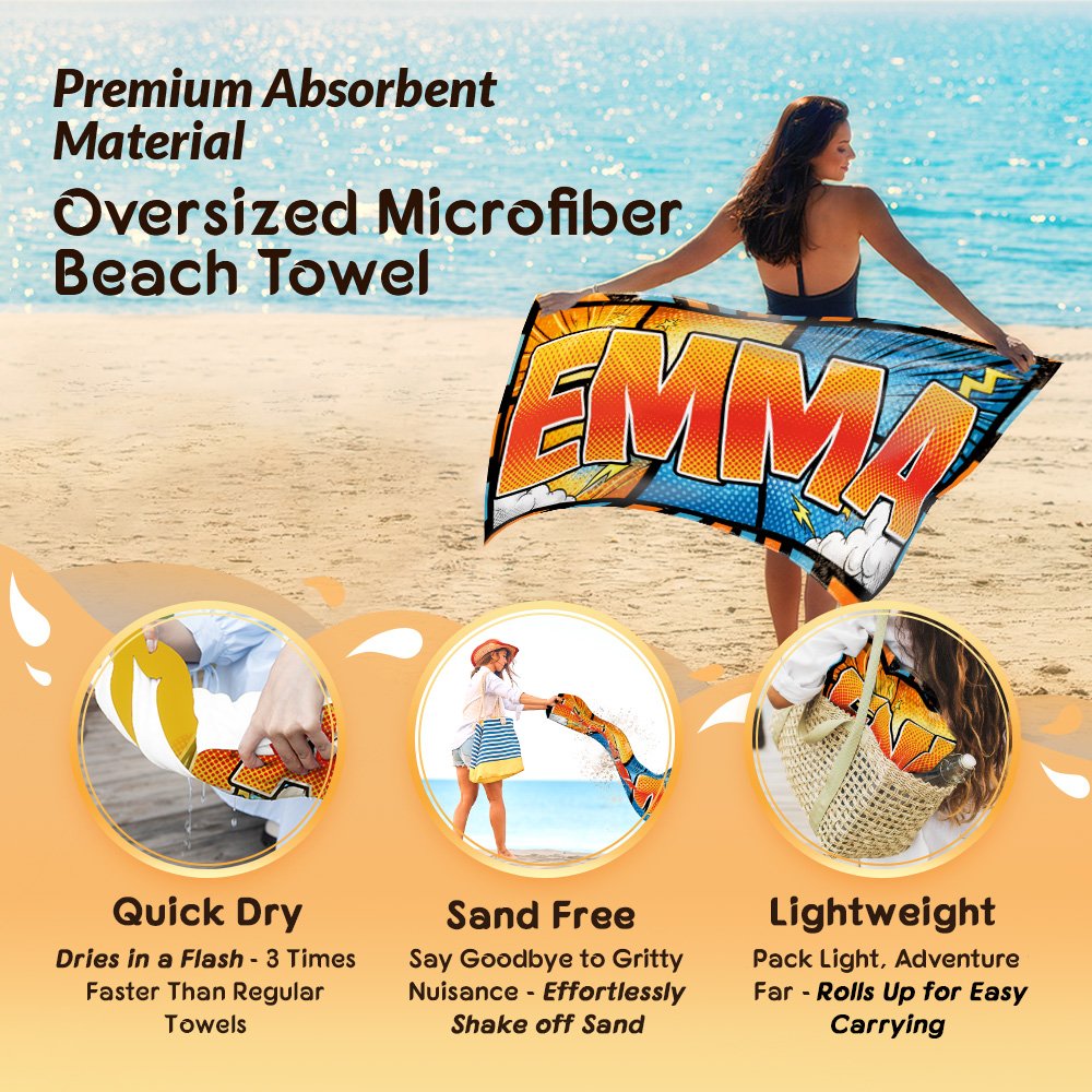 Feature: Super Absorbent, Fast Drying, Durable and Soft, Sand Free, Oversized, Lightweight and Portable, Comic Style Design