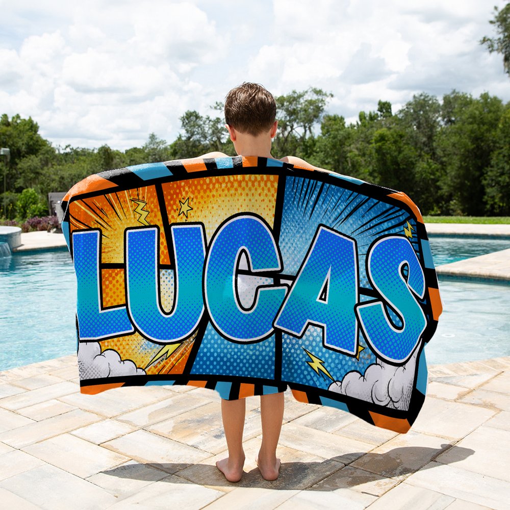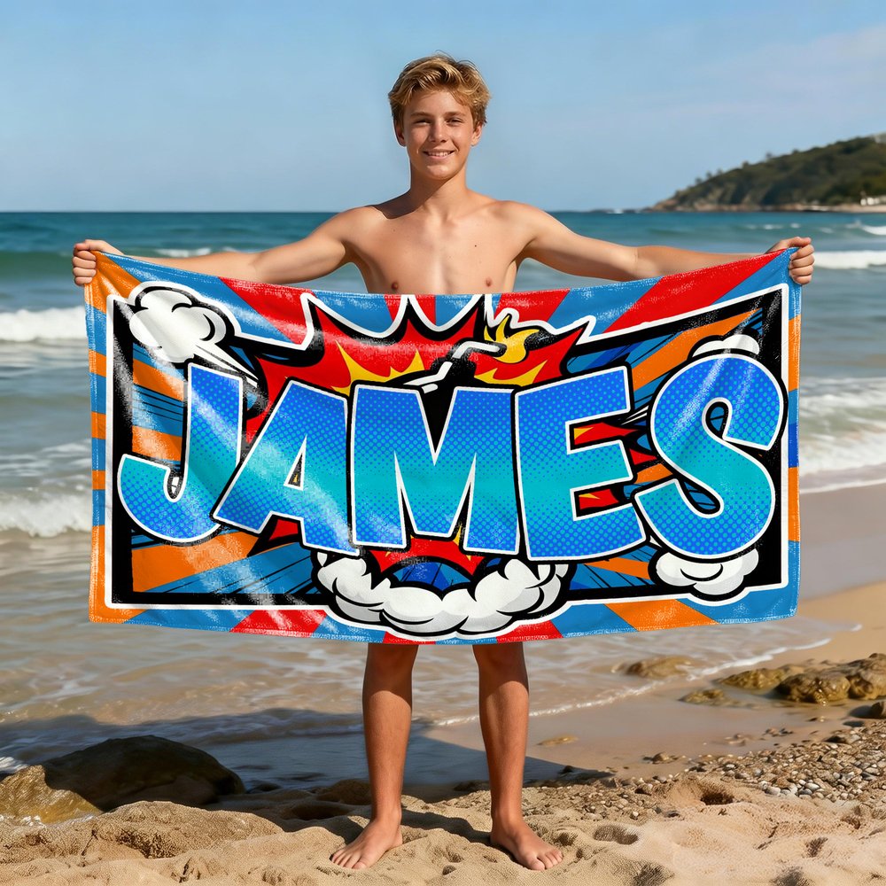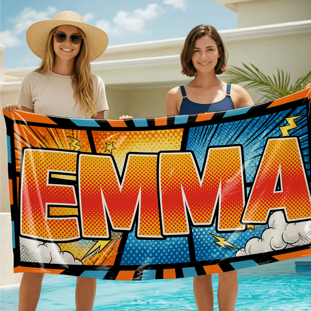 This beach towel features an American vintage comic design, offering three classic comic styles with contrasting outlines and graphic elements like lightning and clouds, creating a visually striking effect. Customize it with your name in high-saturation orange or blue, making the entire beach towel look like a double-page spread torn straight from a comic book.