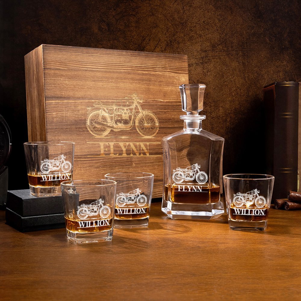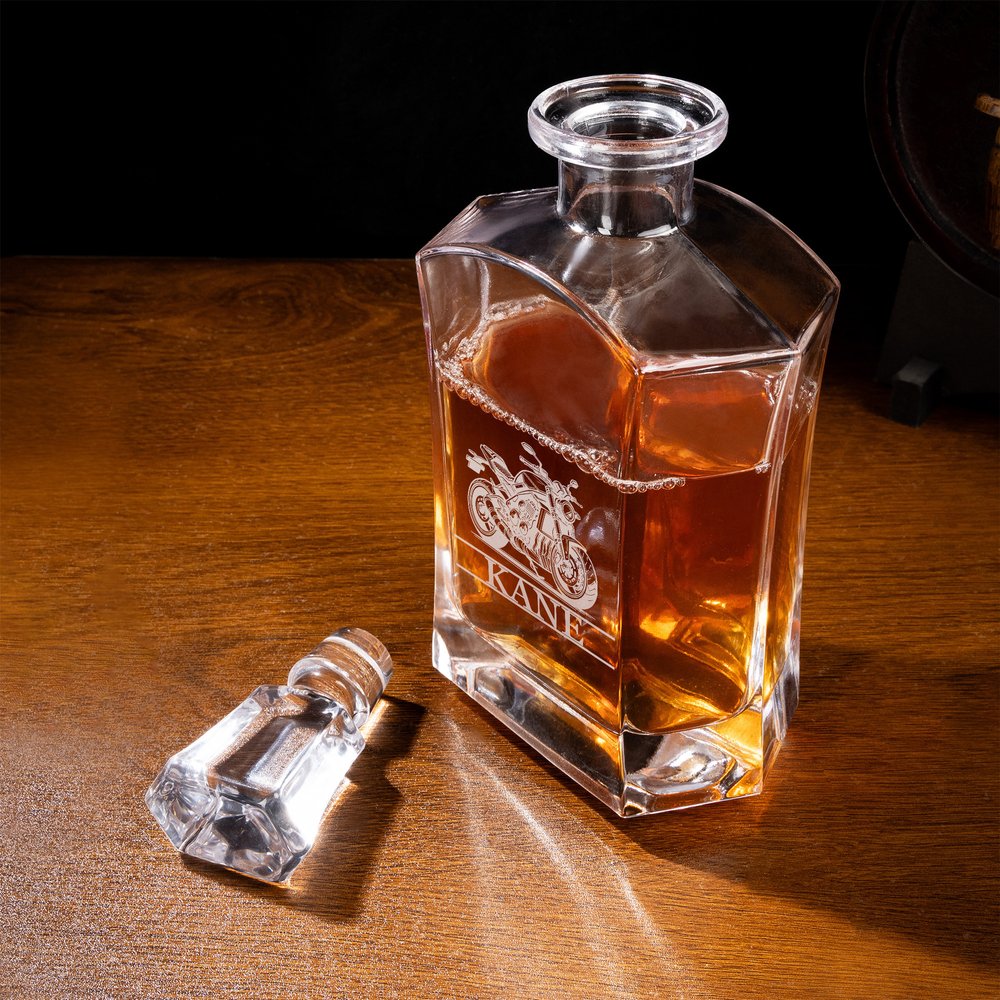 This decanter boasts a unique design, featuring a cool motorcycle theme as its core element. The smooth lines outline the dynamic silhouette of a motorcycle, as if it's ready to speed away at any moment. Even more exciting is the option to customize it with your name, engraving your personal logo to make it truly one-of-a-kind.