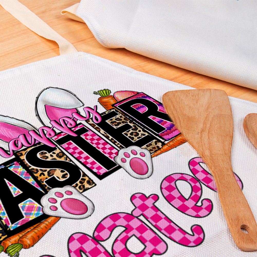 This apron is available in a variety of lively and bright fonts, including pink square plaid, pink gradient, pink and blue striped plaid, and leopard print. These will brighten up any kitchen or Easter celebration.