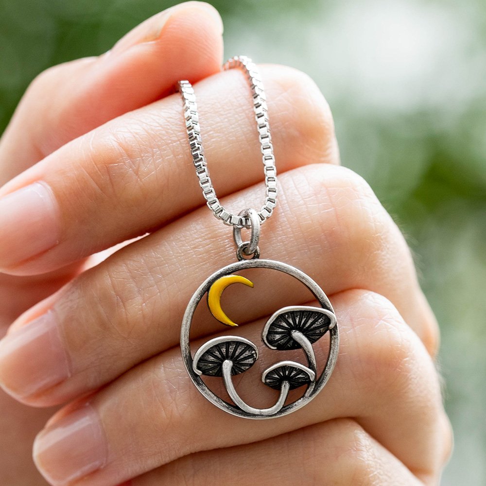 Three cute magical mushrooms and a crescent moon, making it playful and cute overall. The mushroom is the symbol of longevity, energy, and good luck. Reminds you to live in the moment and enjoy the life you earn. Whenever you wear it, there comes with joy and vigor.