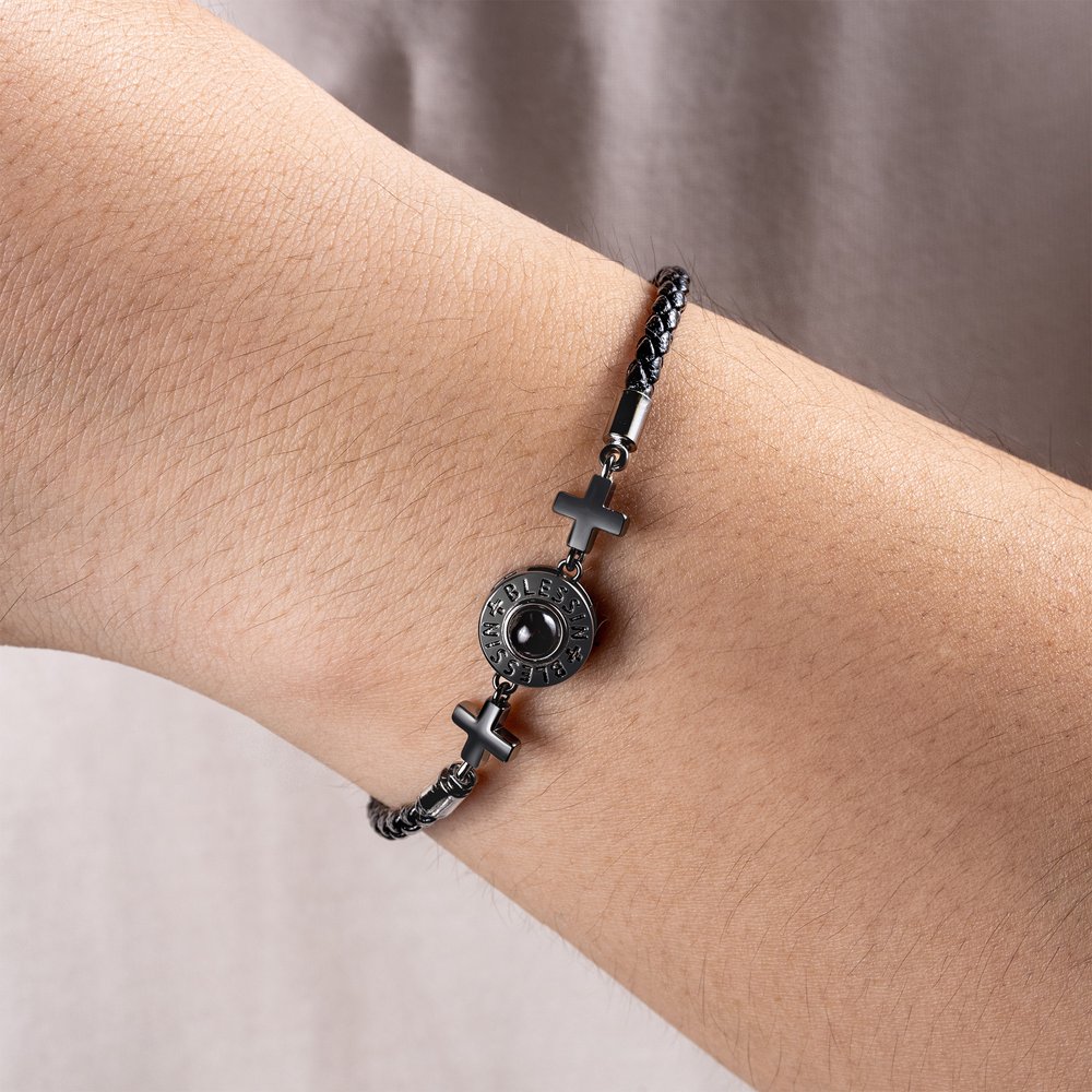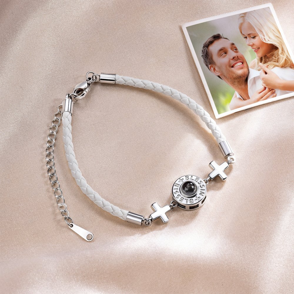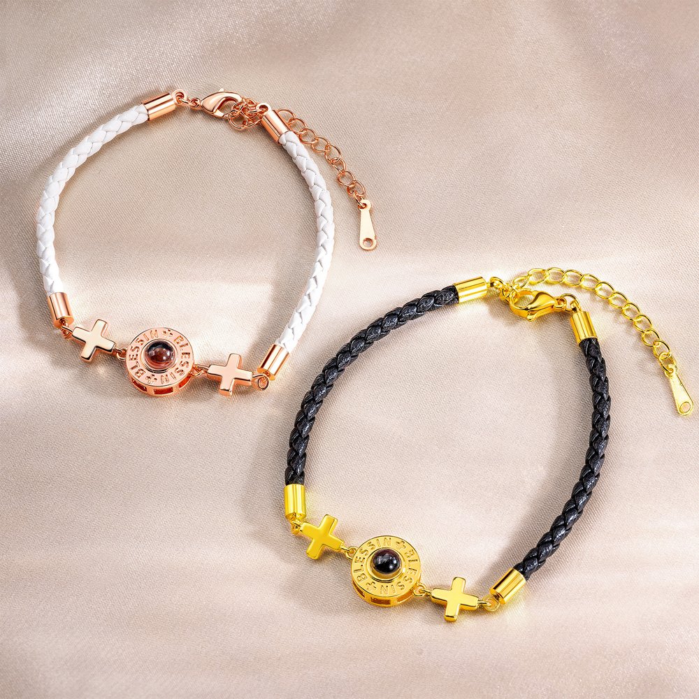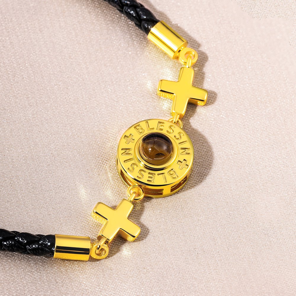 The main body of this bracelet features two meticulously crafted cross-shaped components, symbolizing the sacred connection and spiritual protection of the Christian faith. The circular projection charm, interspersed between them, innovatively incorporates micro-carving technology, allowing selected photos to be finely engraved and displayed. This design, which seamlessly blends elements of faith with personal emotion, makes the bracelet both sacred and warm.
