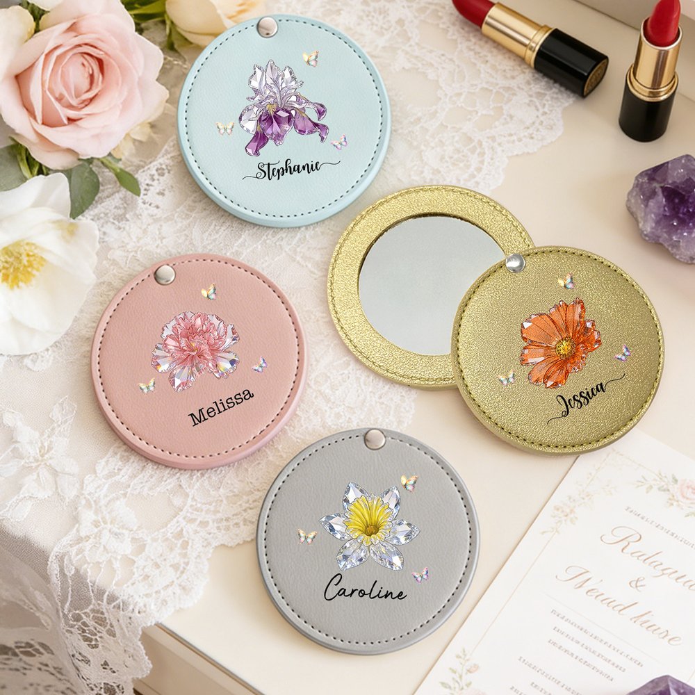 Personalized Crystal Birth Flower Butterfly PU Leather Makeup Mirror with Name Valentine's Day Birthday Anniversary Gift for Women