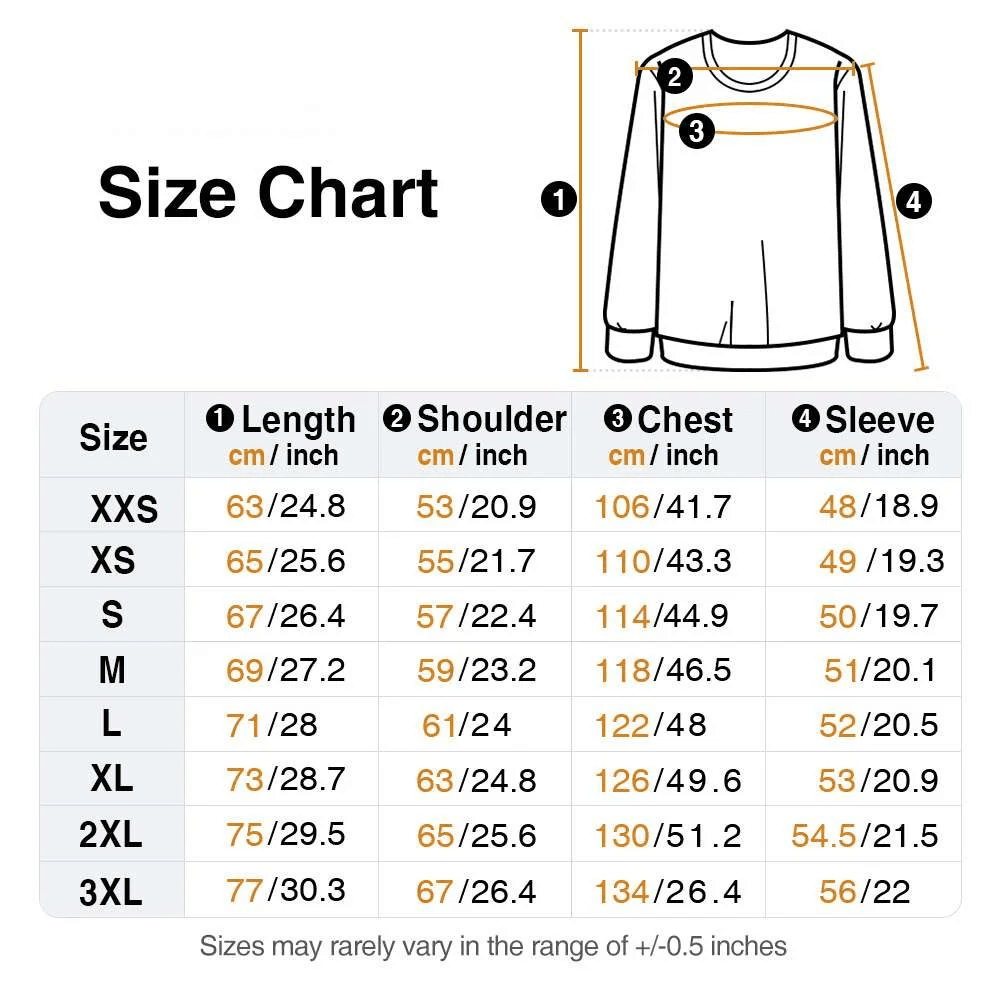 | Measurement: | T-Shirt - XXS, XS, S, M, L, XL, 2XL, 3XL, 4XL, 5XL Sweatshirt - XXS, XS, S, M, L, XL, XXL, 3XL |