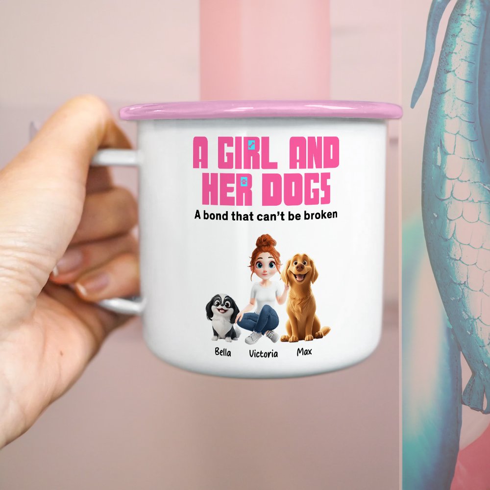 This mug features a unique cartoon design that shows the warm relationship between a girl and her dog. The mug is printed with a cute girl and 1-5 dogs. You can also customize your name and your pet's name to make it a unique and exclusive souvenir. The carefully designed "A GIRL AND HER DOG, A bond that can't be broken" text adds a sense of story and emotional depth.