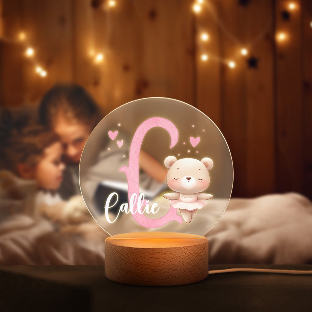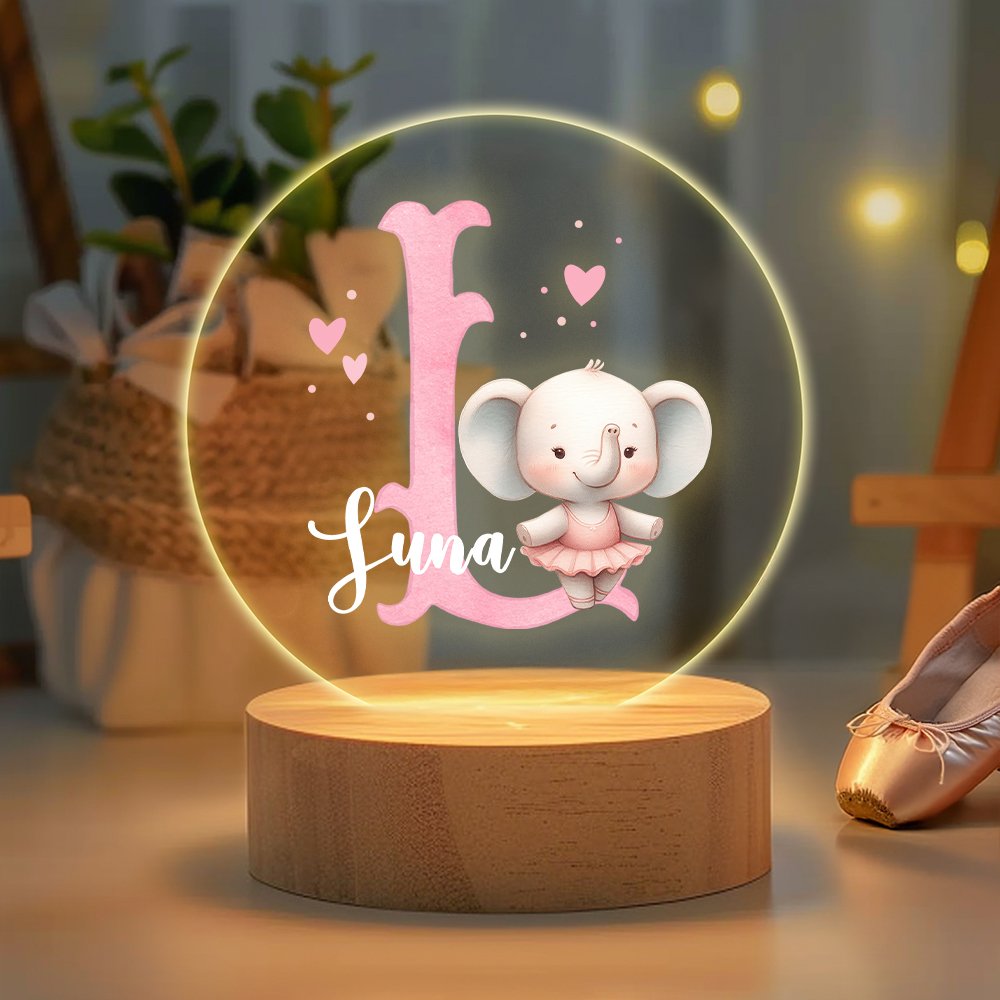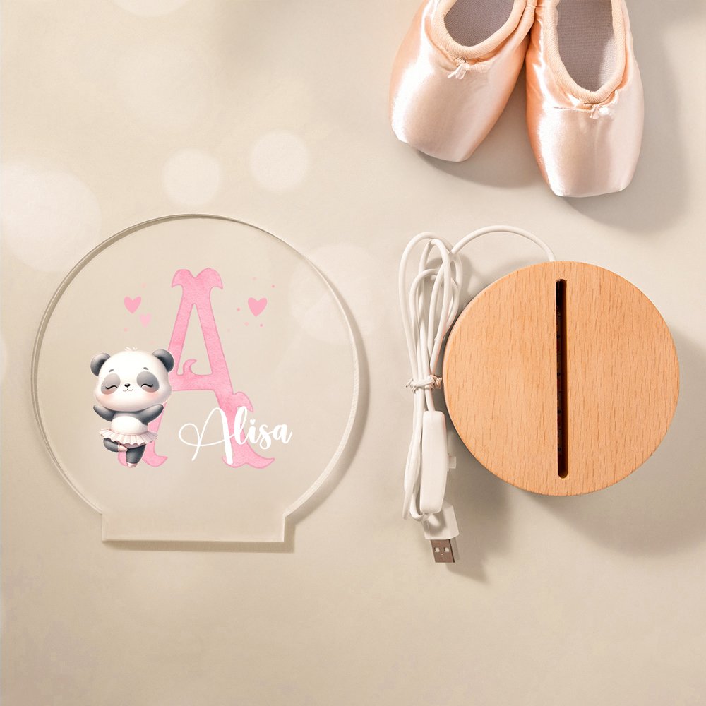 Personalized Cute Animal Ballerina Initial Name LED Night Light with Wooden Base Nursery Decor Birthday Gift for Ballet Lovers
