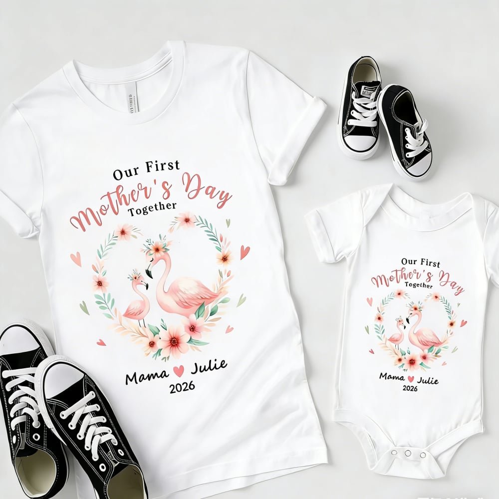 This parent-child outfit takes the warm phrase "Our First Mother's Day Together" as its core design element, paired with adorable parent-child animal patterns. It is surrounded by delicate floral and heart decorations, creating a strong festive atmosphere. The clothes are also specially customized with names and the year, making this set of clothing even more commemorative. It serves as a perfect testament to a first-time mother and her baby celebrating their first Mother's Day together.