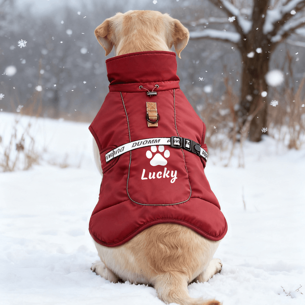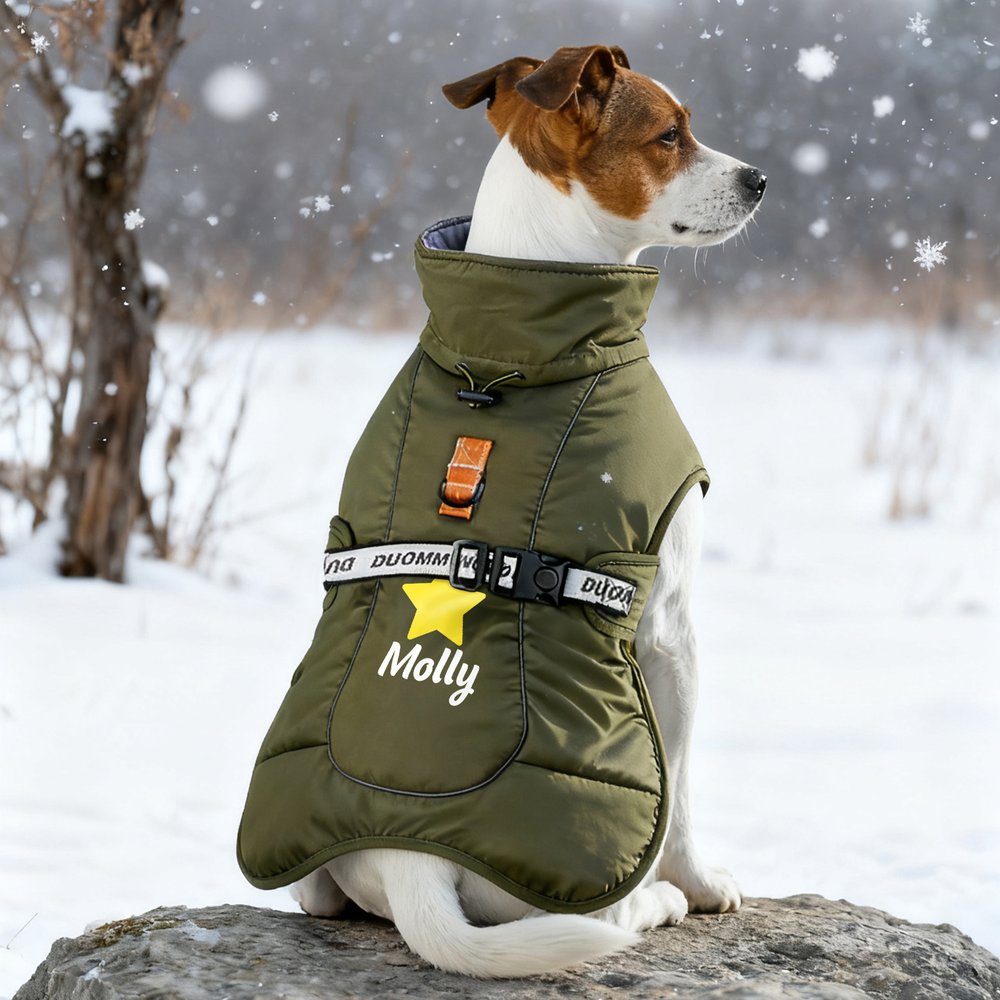 This pet winter windproof jacket features customizable designs like paw prints, bones, or stars, plus your pet’s name. With 4 stylish colors, it blends fashion and personal flair, making your dog’s winter look unique and eye-catching.