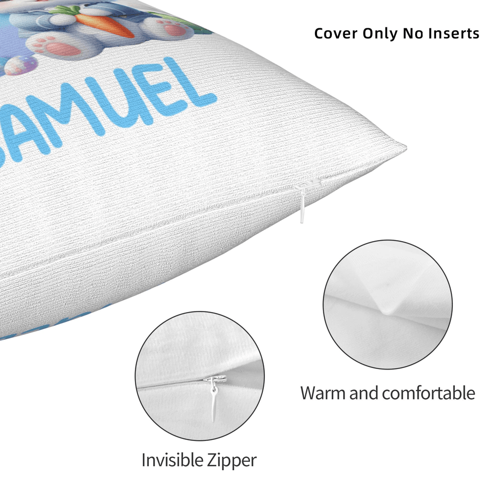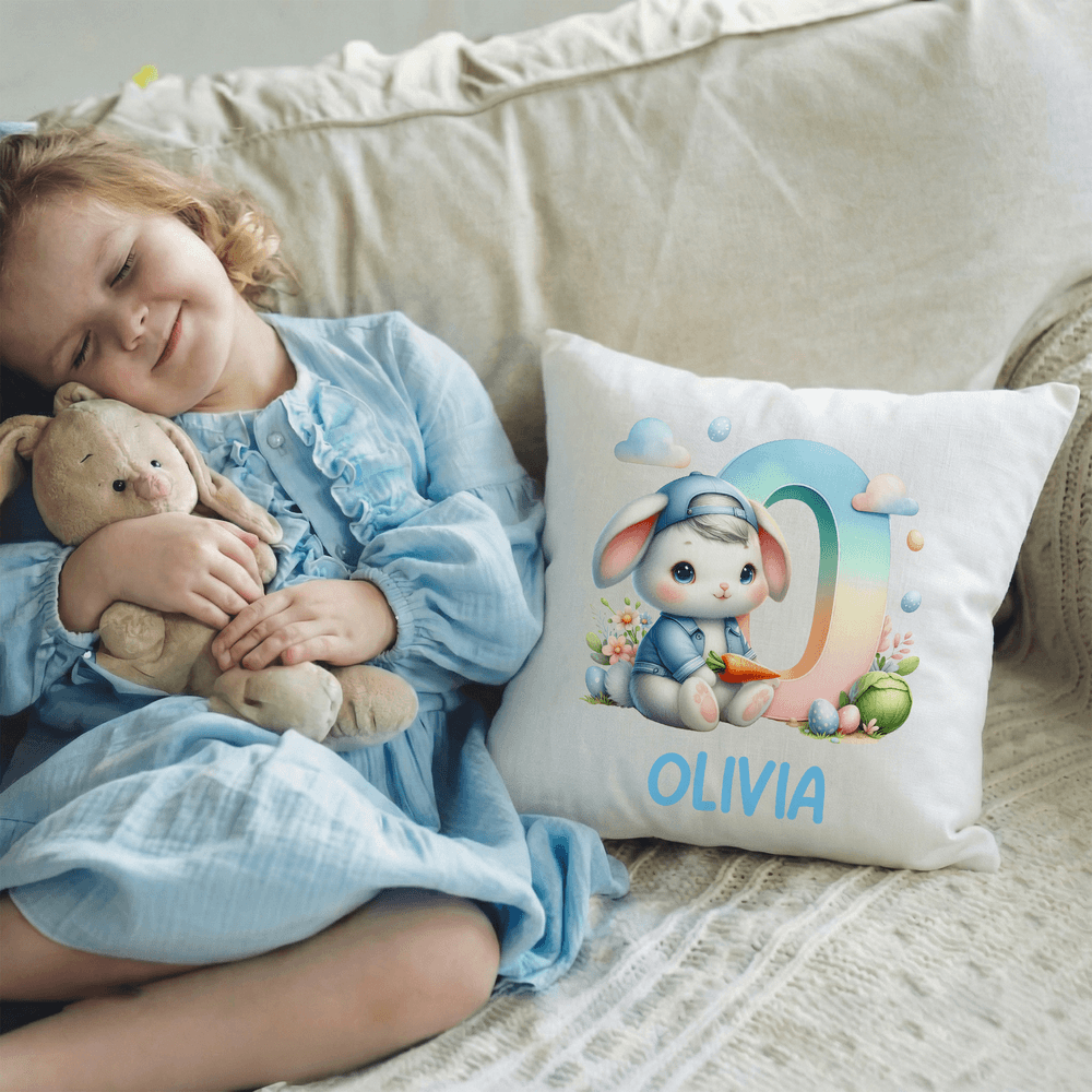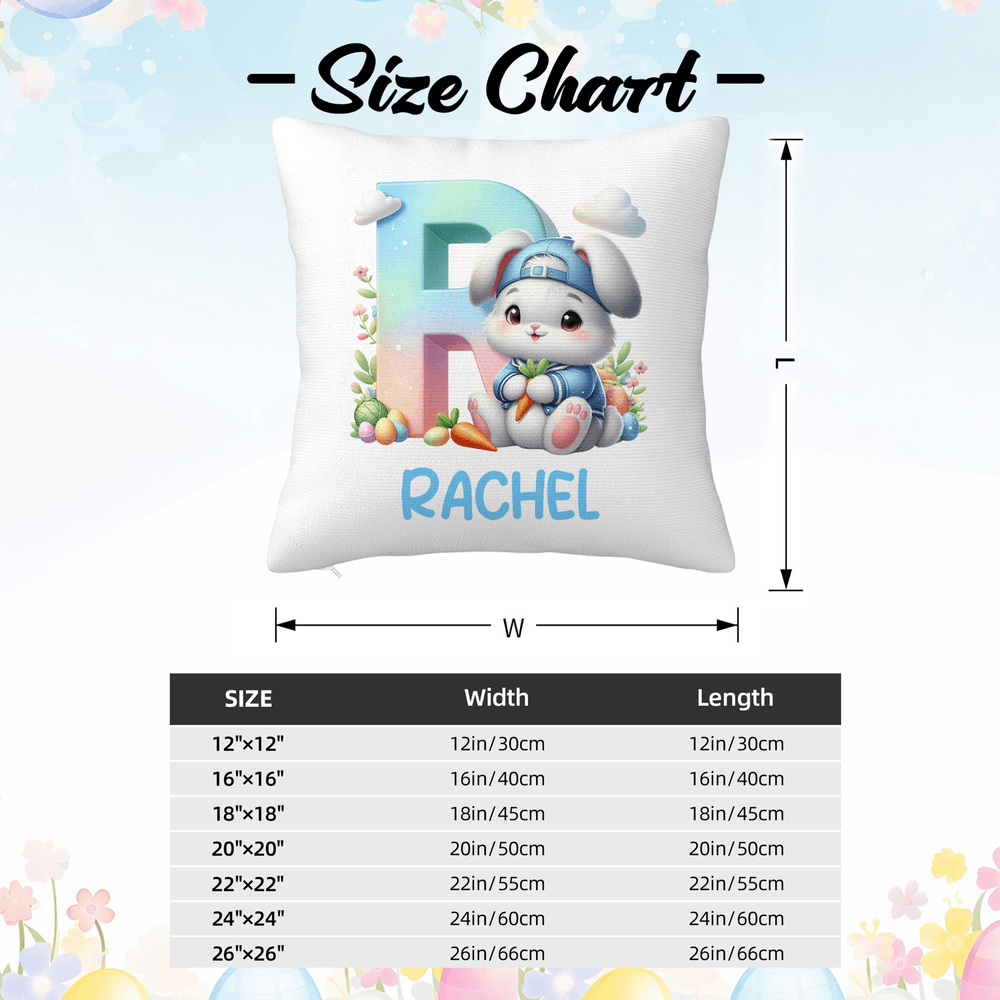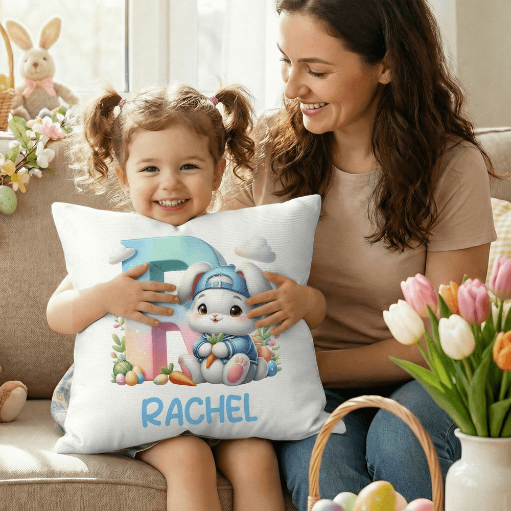This throw pillow features the classic Easter bunny as its main cartoon character, combined with elements of Easter eggs, clouds, and carrots. The design is cute, fun, and full of festive spirit; it supports customization with initials or full names, creating a unique and personalized pillow for your child.