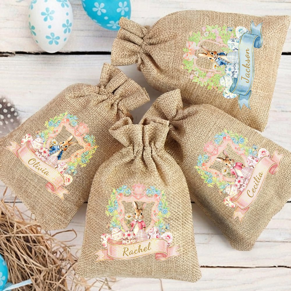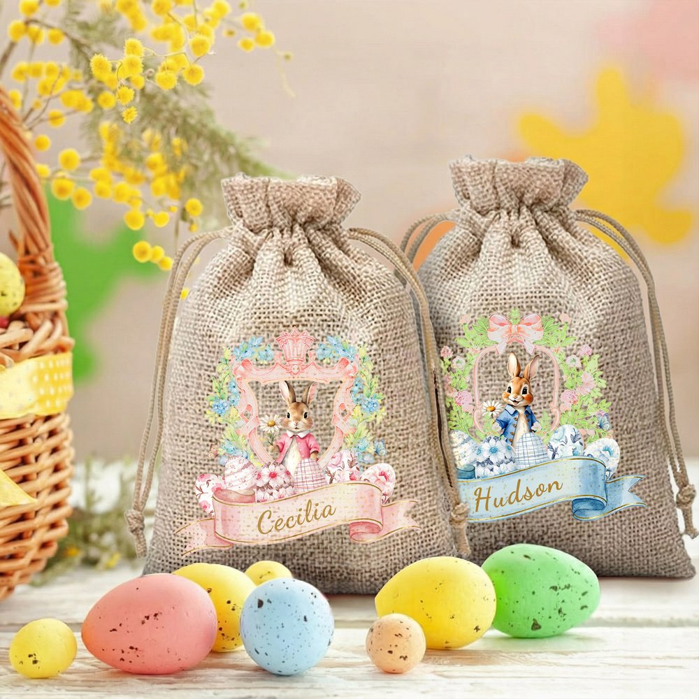 Personalized Cute Bunny Floral Wreath Ribbon Jute Drawstring Gift Bag with Name Easter Hunting Party Gift for Boys Girls