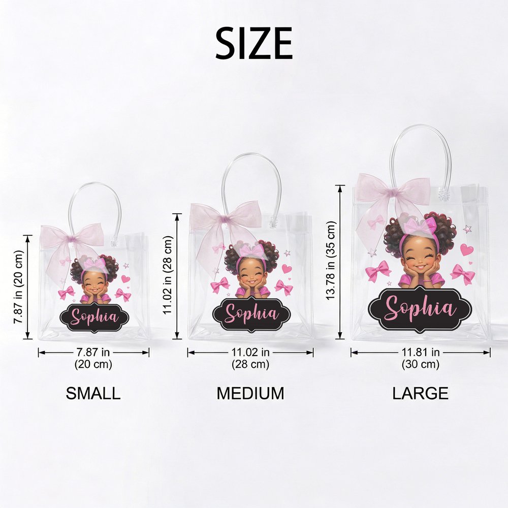 Featuring a cute cartoon image of a little Black girl adorned with sweet pink ribbon bows, this tote bag offers customizable character designs. It even allows for name customization, creating a truly unique and personalized experience. In addition, the bag is available in three sizes.