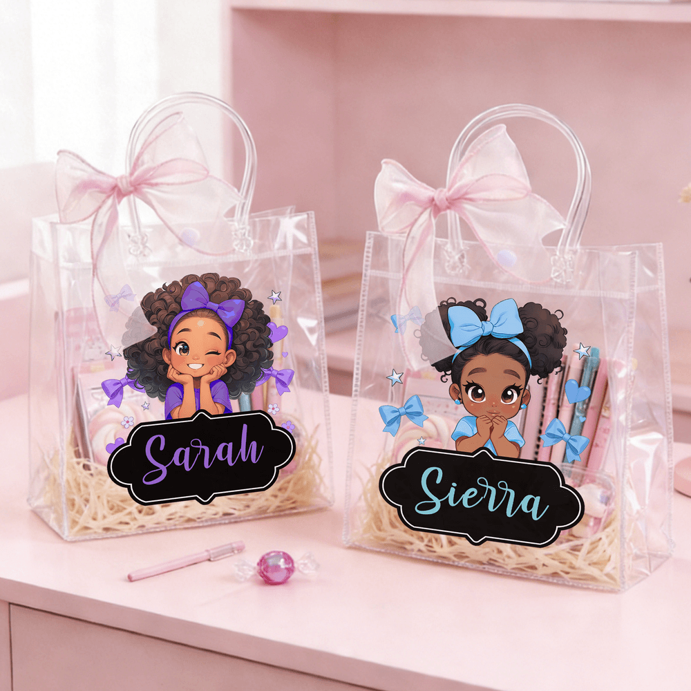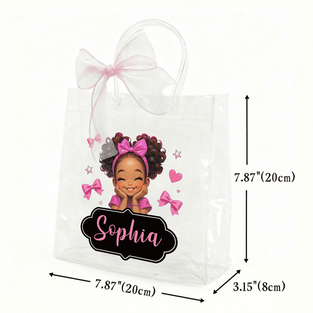 Featuring a cute cartoon image of a little Black girl, adorned with sweet pink ribbon bows, this tote bag offers customizable character designs. It even allows for name customization, creating a truly unique and personalized experience.