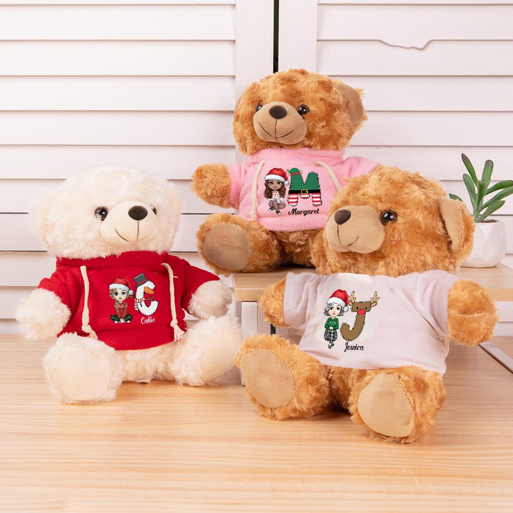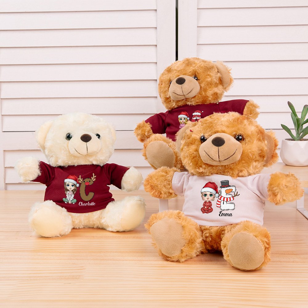 This personalized teddy bear is an absolute delight! The design is truly one-of-a-kind, featuring a cute cartoon character on its clothing. The character is dressed in festive attire, with Santa hat-like elements, which make it perfect for Christmas celebrations. The inclusion of a cute design initial and a name adds a special touch that makes the teddy bear unique to the child receiving it. The bear has a plush, soft texture that kids will love to cuddle. Its round face, with big, black eyes and a cute little nose, gives it an endearing expression.
