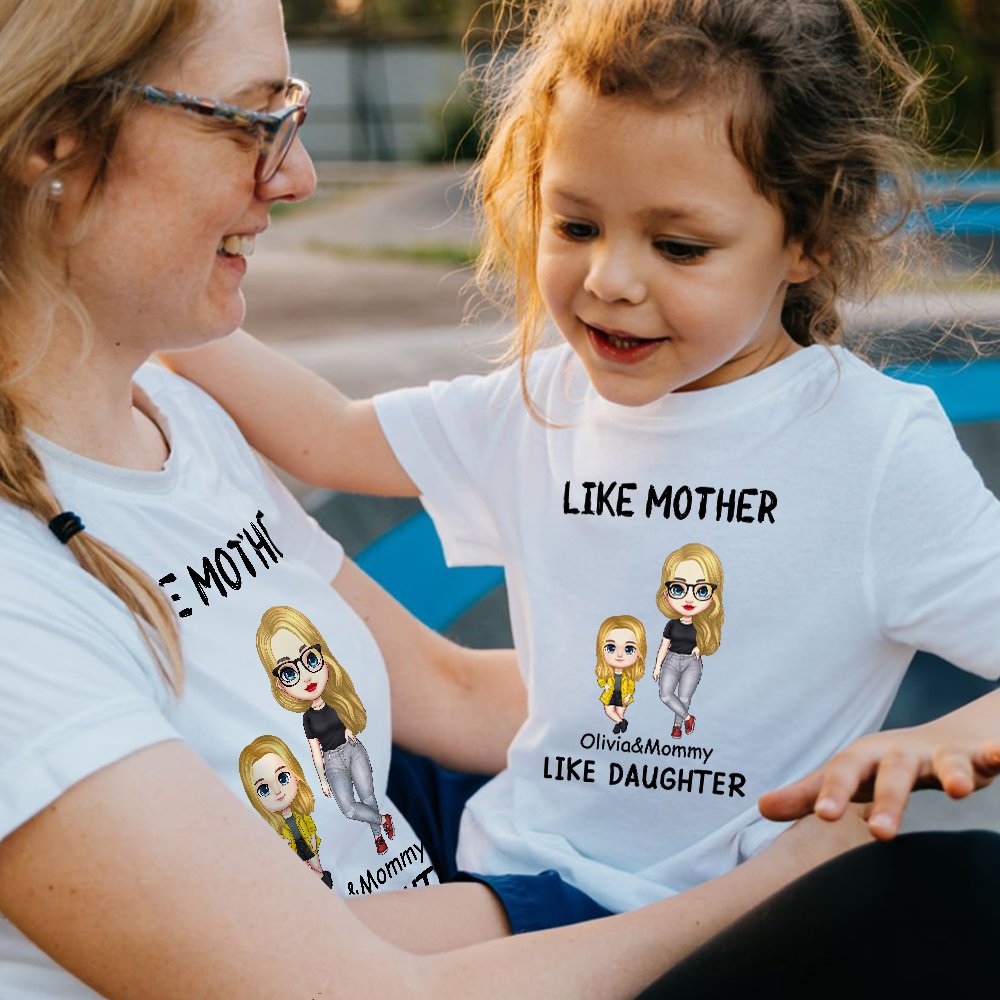 This clothing is printed with "LIKE MOTHER" and "LIKE DAUGHTER". It is set against a cartoon image of a mother and child standing, symbolizing that maternal love is as gentle and tolerant as the spring breeze. Each piece of clothing can be customized with your and your child's name, making this love more unique and memorable.