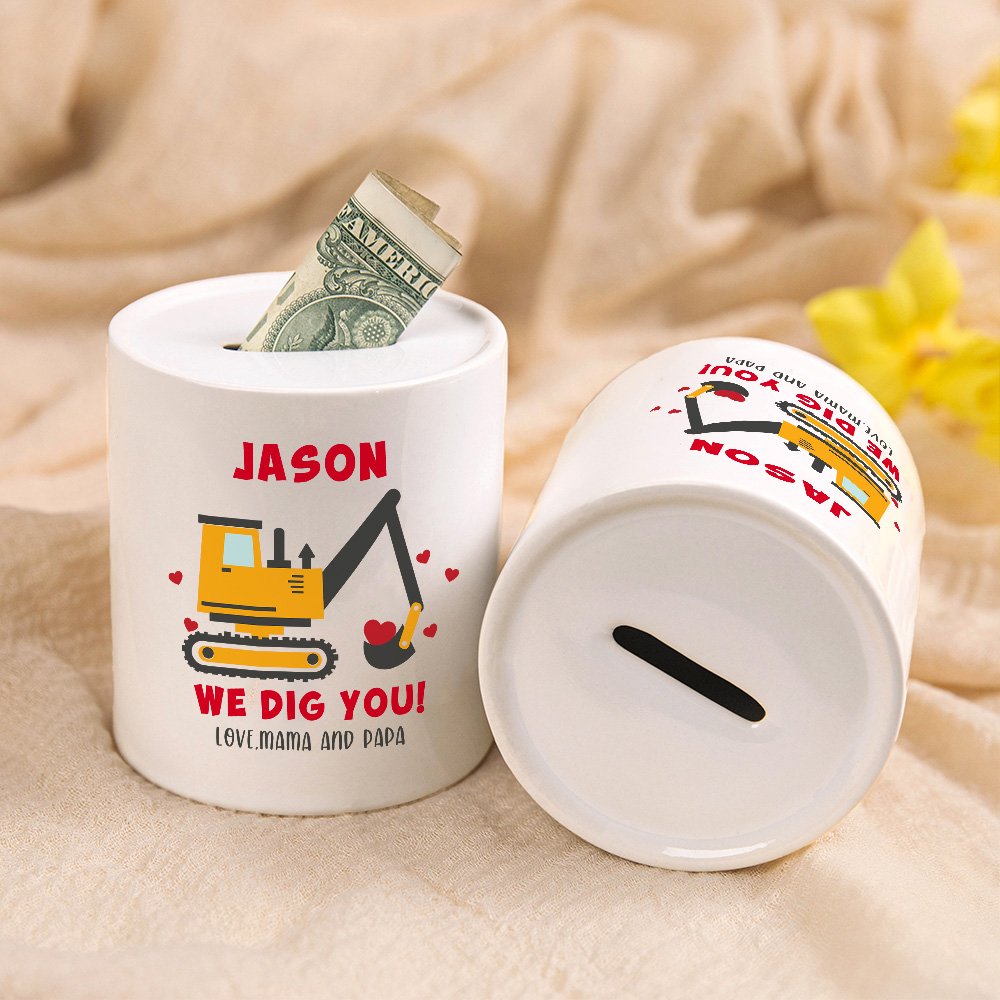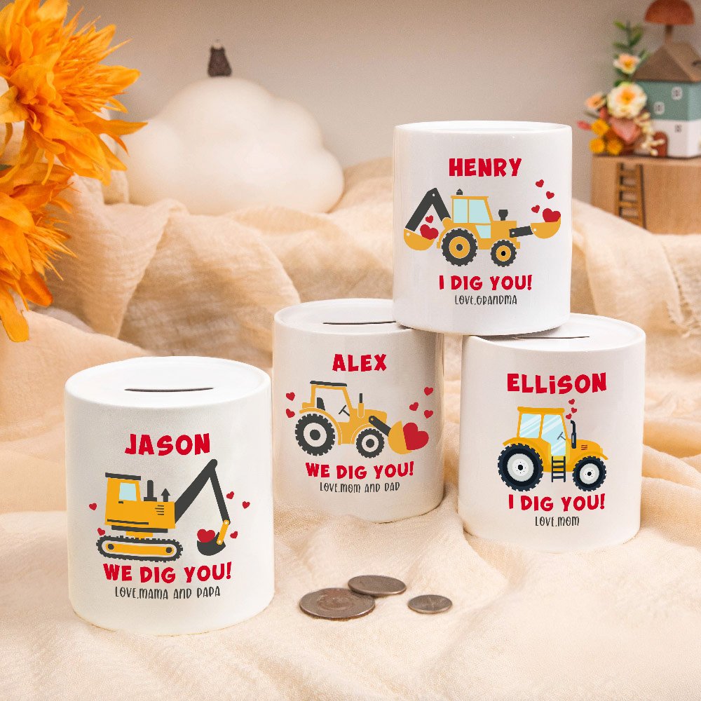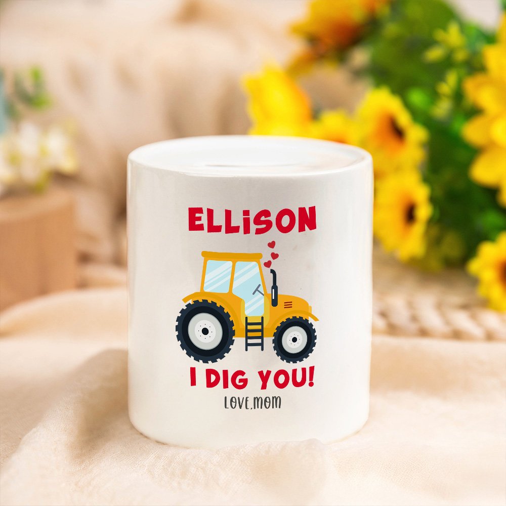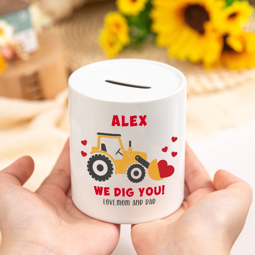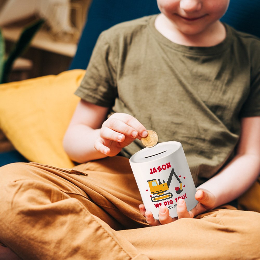 This charming money box features a cute excavator pattern, tailored to your child’s name and a heartfelt text for a truly unique touch. It is a special keepsake that children will cherish as they grow.